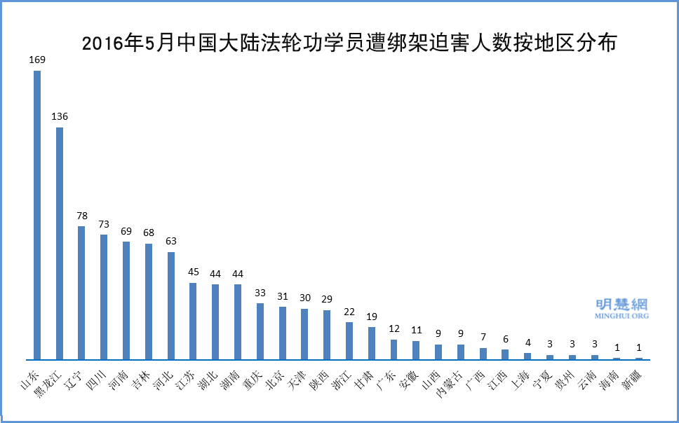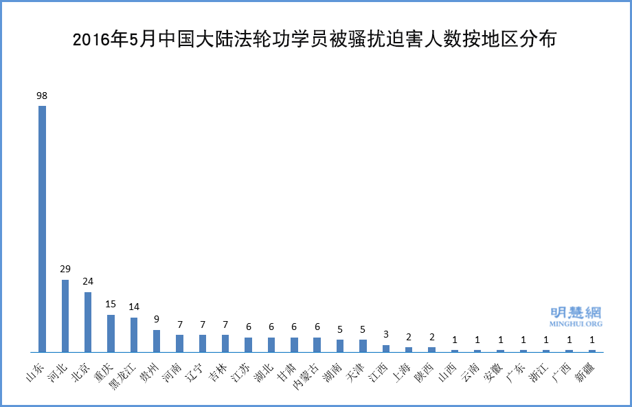 ![]() 2016年5月中国大陆法轮功学员被骚扰迫害人数按地区分布 |