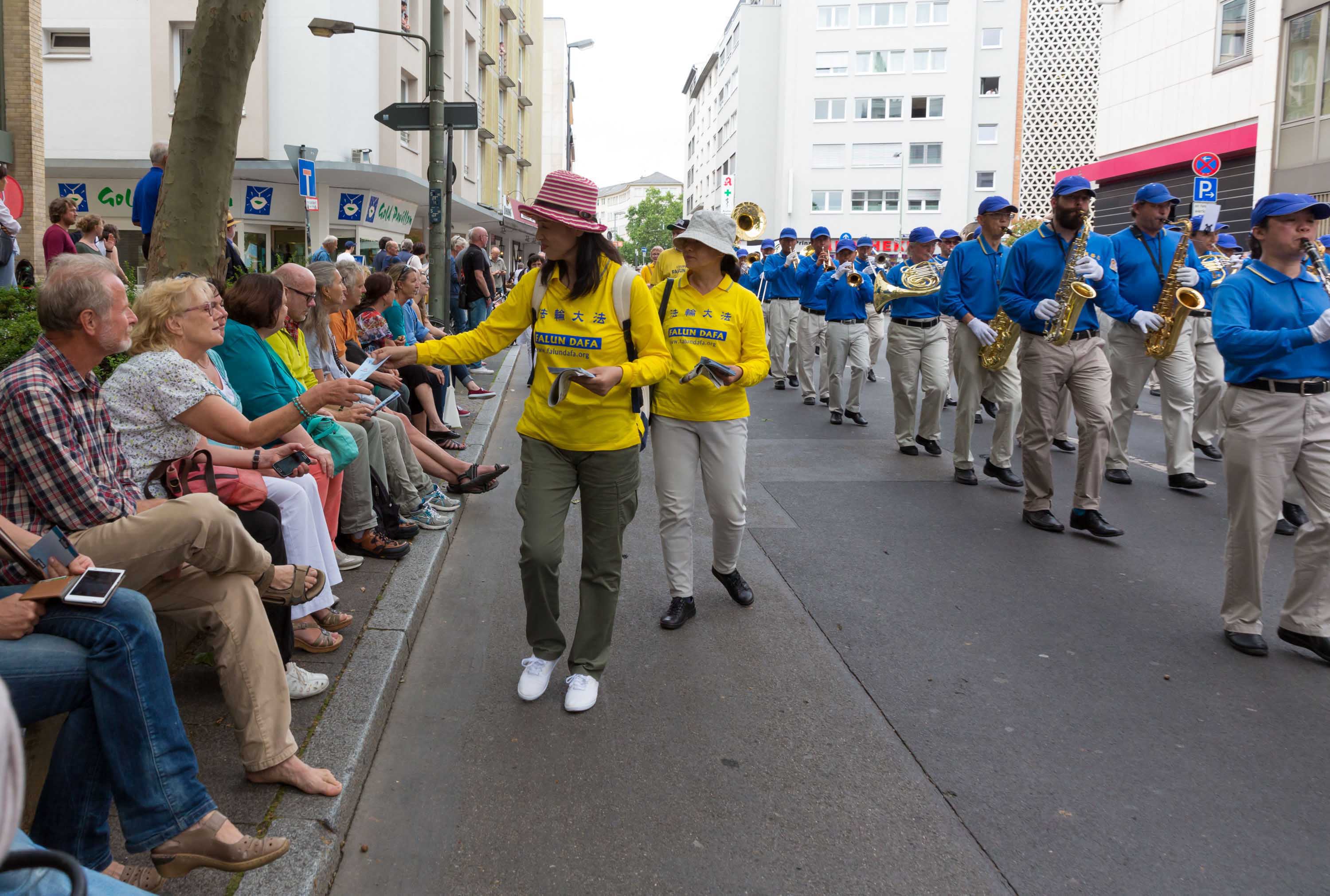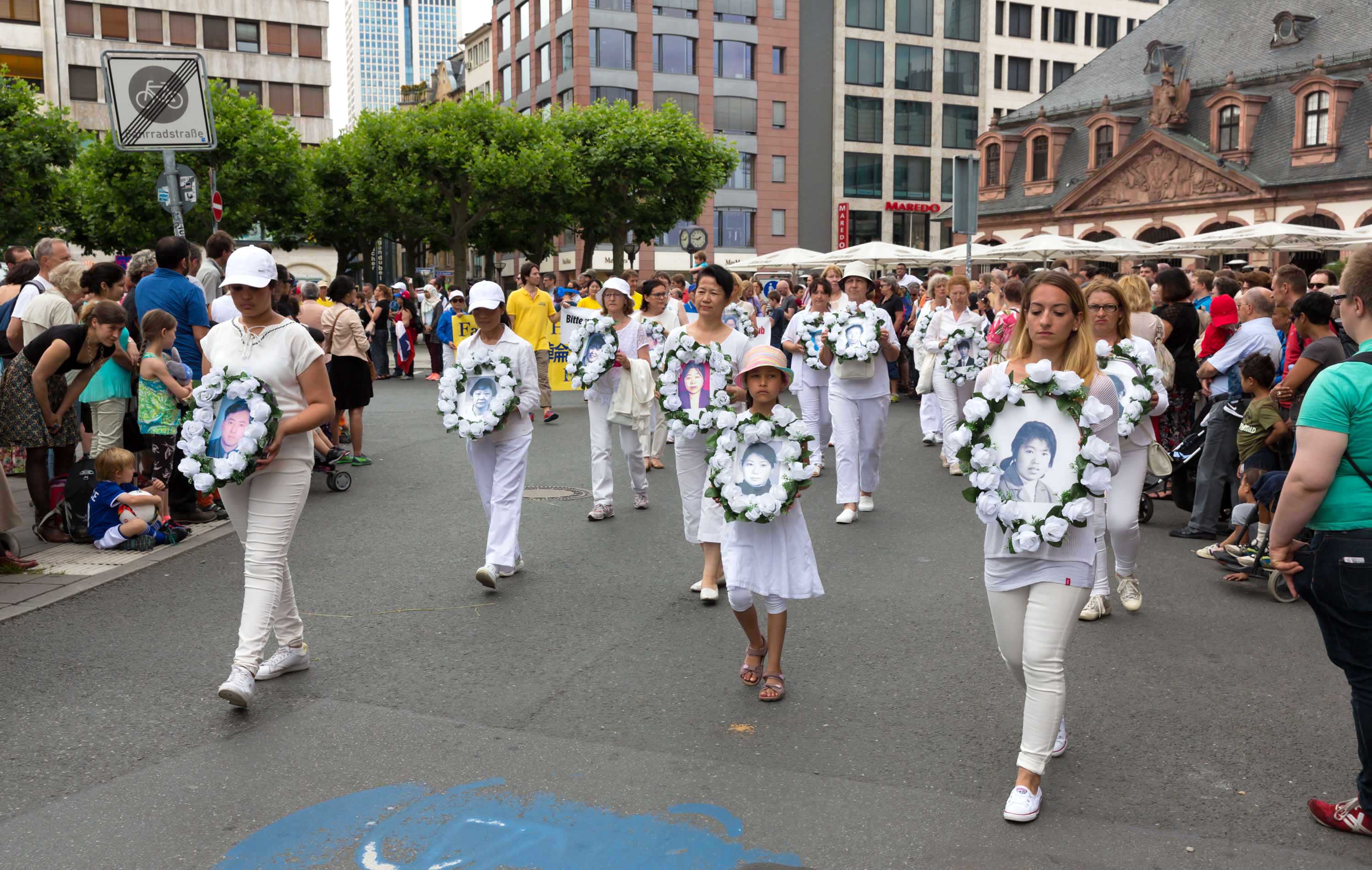 游行队伍从美茵河畔出发,经过法兰克福闹市区和购物中心、歌德故居,最后抵达市政府所在地的罗马广场,沿途民众非常热情,人们被天国乐团的音乐震撼,纷纷接过法轮功学员手中的资料。当他们看到法轮大法花车和仙女队伍时,不少人拍照留影,纷纷掏出手机和照相机摄影留念。当他们看到法轮功学员受中共迫害,仍在传播真相时,肃然起敬。