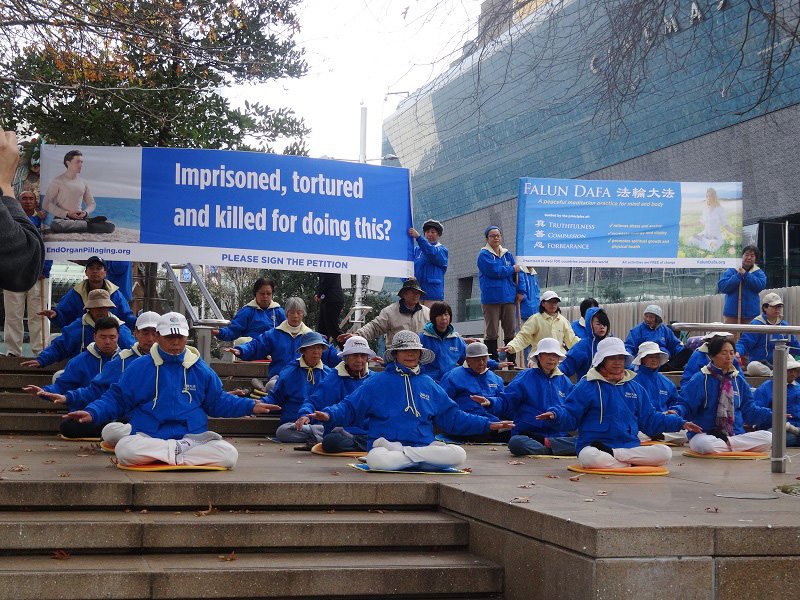 新西兰奥克兰市中心的奥缇亚广场上,法轮功学员演示功法