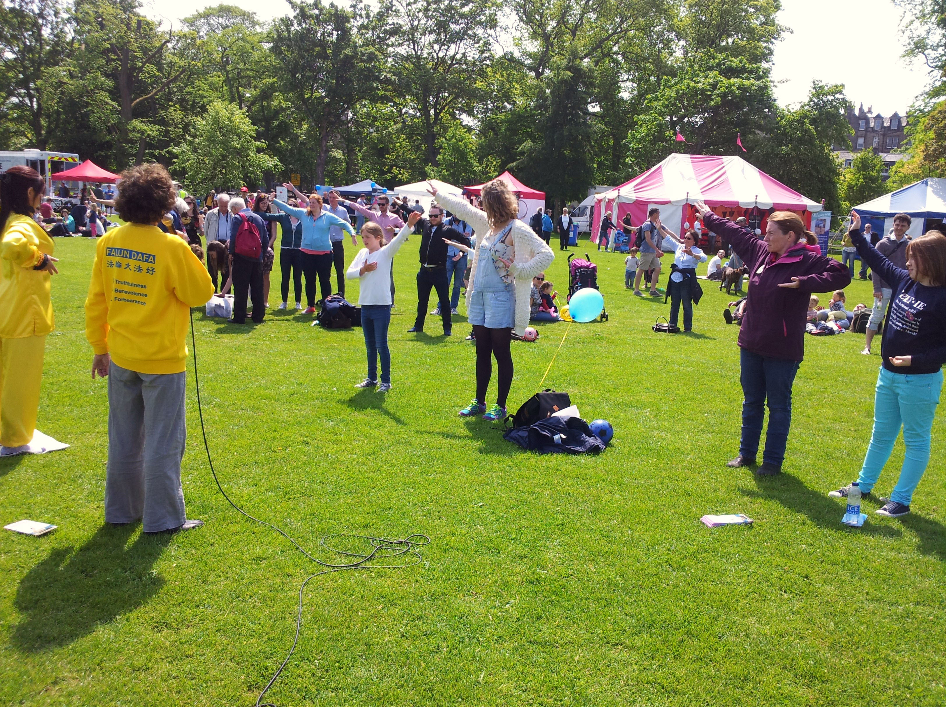 法轮功学员在爱丁堡草地音乐节上现场教功