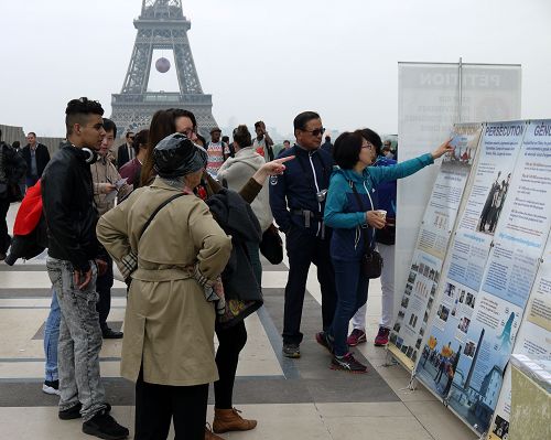 ![]() 图3:巴黎人权广场上,中国大陆游客观看法轮功真相展板 |