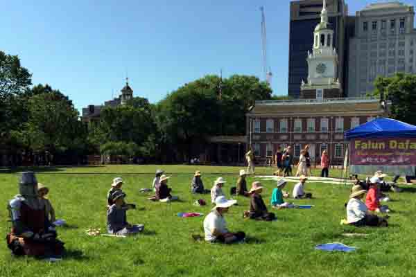 在美国费城自由钟广场,英国著名制片人兼导演John Blystone先生(左一),坚持与法轮功学员一起打坐