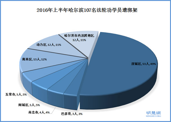 根据明慧网报道统计,二零一六年上半年哈尔滨有107名法轮功学员及家属遭绑架迫害,年龄最少的仅三岁。