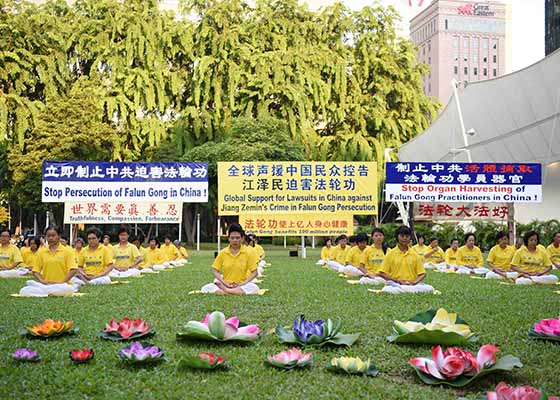 新加坡法轮功学员在芳林公园举办活动,纪念十七年来法轮功学员走过的艰难岁月,揭露中共活摘法轮功学员器官的暴行,征集签名联署举报元凶江泽民。