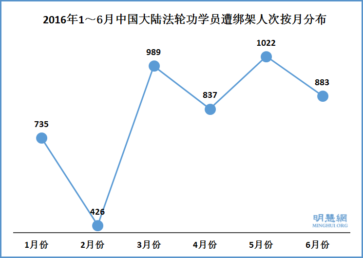 2016年1~6月中国大陆法轮功学员遭绑架人次按月分布