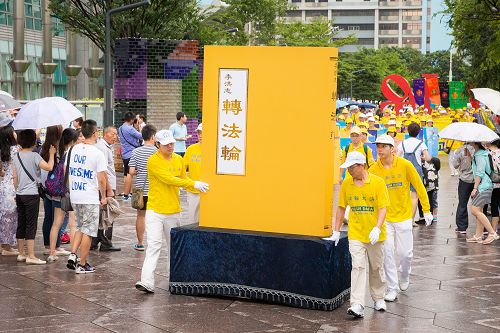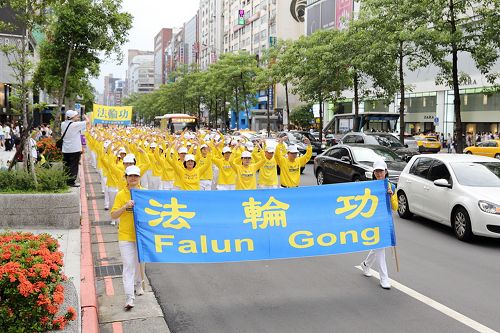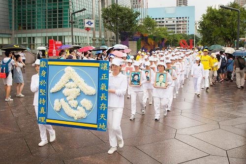 台北市政府前信义广场,从上午十点至晚上六点,台湾法轮功学员在现场教民众五套功法,还有法轮大法“正法之路图片展”活动。下午三点法轮功学员游行队伍开始出发,由气势磅礴的天国乐团演奏雄壮的乐曲领队,后面有“大法洪传”、“千古奇冤”、“结束迫害”等方阵,队伍行经一零一大楼国际金融中心,穿越台北最繁荣的信义商圈与东区街头,行经台北市政府及各大学等文教区域,终点抵达台北市政府前的市民广场,全程共六公里。