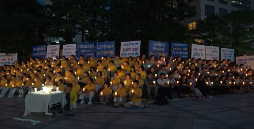 图1-3:二零一六年七月二十日傍晚,韩国部份法轮功学员举行烛光夜悼,悼念那些因坚持信仰而被中共迫害虐杀的法轮功学员。