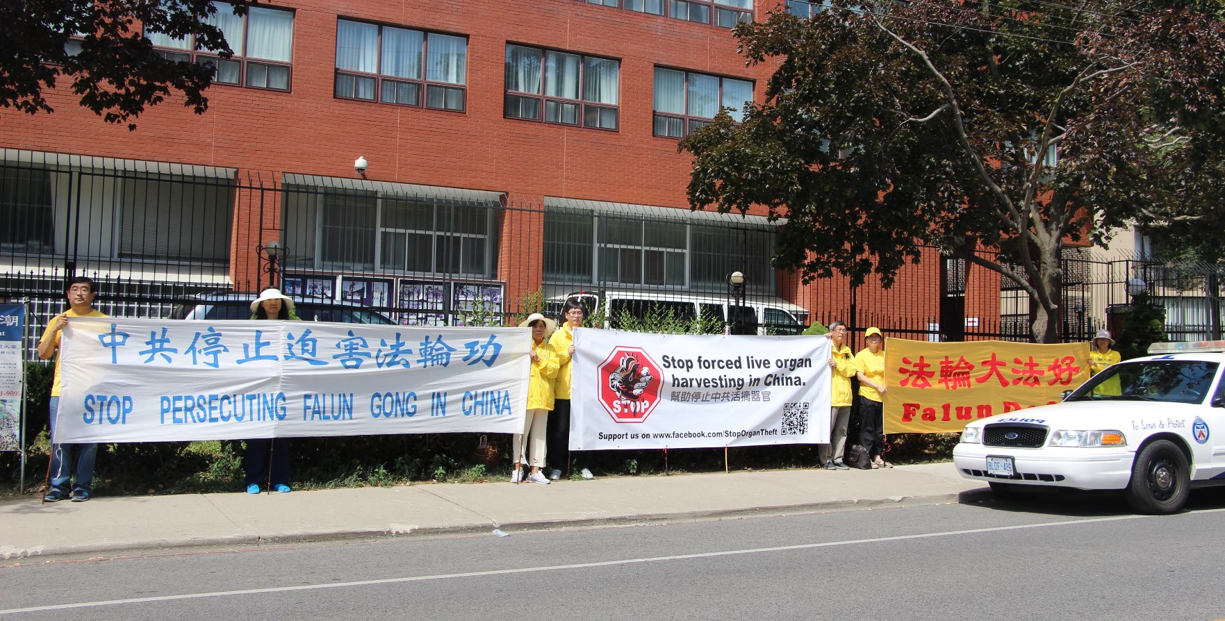 【明慧网二零一六年七月二十二日】(明慧记者多伦多章韵报道)二零一六年七月二十日,在法轮功和平理性反迫害十七周年之际,数百名多伦多法轮功学员和民众一起,上午十一点半在中领馆举行了新闻发布会,揭示真相,呼吁“制止活摘 法办元凶”;下午四点开始在繁华路段女王街(Queen Street)和央街(Yonge Street)十字路口处拉起了以“制止中共活摘人体器官”为主题的真相长城,给上班族的民众面对面讲真相;晚上八点至十点,四百多名法轮功学员在中领馆前举行了烛光悼念活动,谴责中共暴行,呼唤正义良知,结束迫害。一天的三次活动得到很多民众的支持。