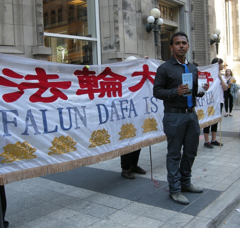 任职于加拿大大银行之一满地可(BMO)银行的Rid Mamun先生在工作之余走到街上,看到法轮功学员举的横幅后,就不停地给法轮功学员和横幅照相。他说:“我觉得应该立即制止这场迫害,没有人有权利去夺走别人的生命!”
