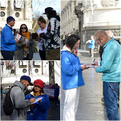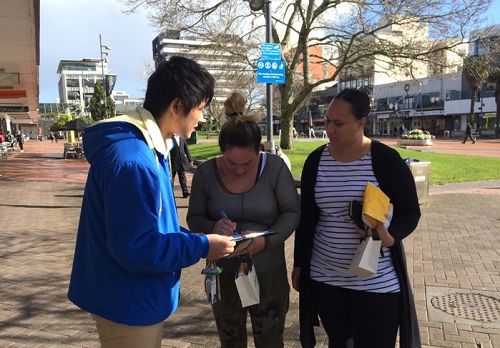明白真相的新西兰民众纷纷在反对活摘器官的征签表上签下了他们的名字。有的民众主动找到手拿征签板的法轮功学员,要求签名支持法轮功。在汉密尔顿、奥克拉和惠灵顿,许多民众都表示要将正的力量汇聚在一起,共同制止这场邪恶、残酷的迫害。