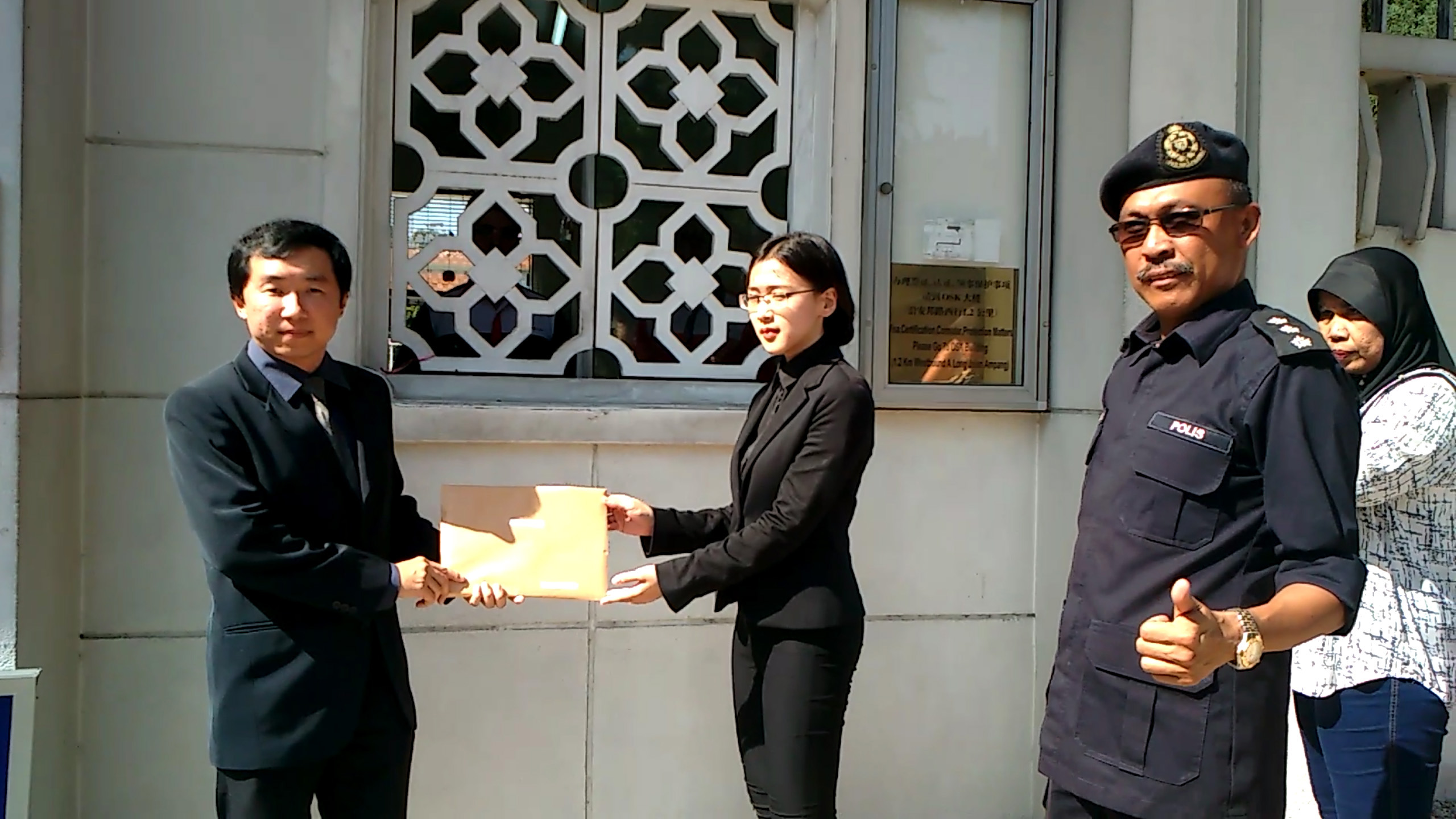法轮功学员代表到中共驻马大使馆递交抗议信。多年来,法轮功学员持续不断的讲真相,使越来越多的官员了解真相。