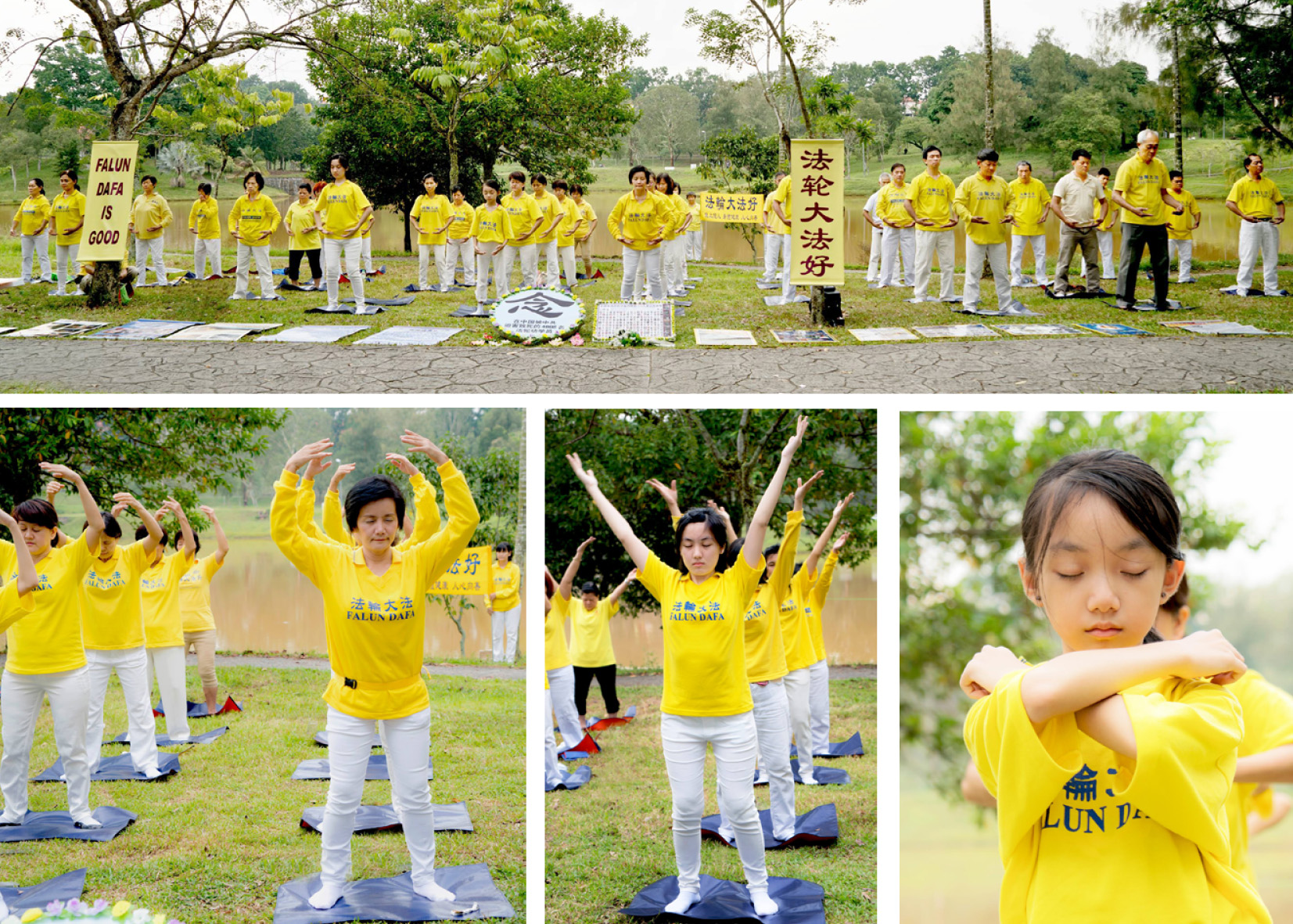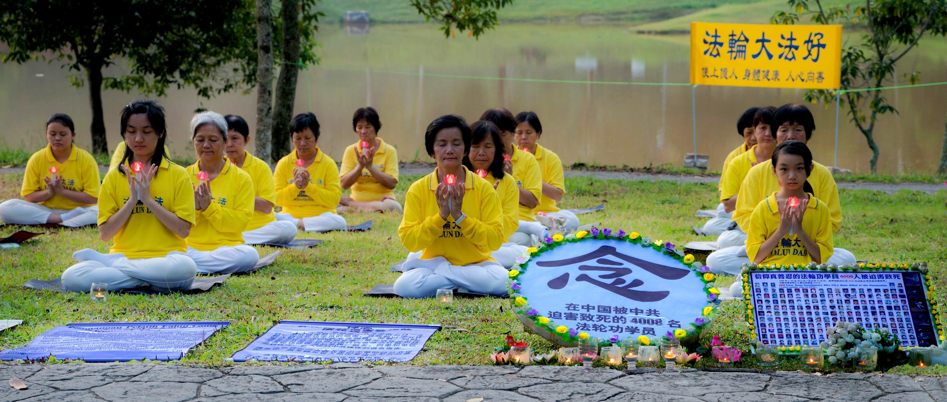 七月二十日当天,部分法轮功学员冒着细雨,在首都吉隆坡蒂蒂旺莎湖滨公园(Titiwangsa Lake Gardens)举行集体炼功和烛光追悼会,悼念在中国大陆被中共迫害致死的法轮功学员。