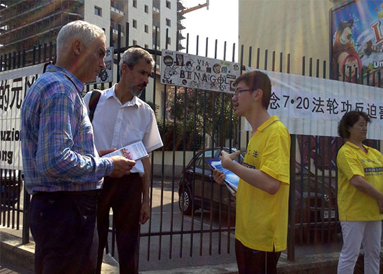 七月二十日,意大利米兰中领馆门外已经排起了队,大多数是华人。法轮功学员来到中领馆前举办纪念反迫害十七周年活动。