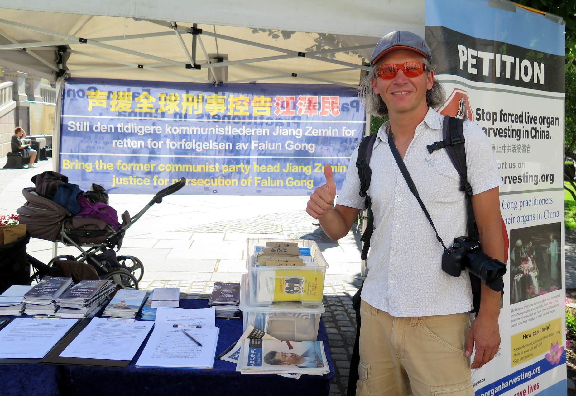 马丁(Martin)是一位德国音乐人,他为儿童写歌并作曲。夏季他带着妻子和孩子在挪威度假。他了解了法轮功在中国所遭受到的迫害后在两份征签表上签下自己的名字。他对学员说:“感谢你们正的能量!感谢你们在这里!能够帮助我感到幸福!”