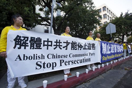 ![]() 图1-7:二零一六年七月二十日傍晚,洛杉矶中领馆前烛光摇曳,上百名法轮功学员举行烛光夜悼,呼吁停止迫害、法办迫害元凶江泽民。 |
