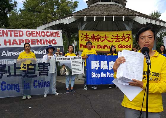 加拿大埃德蒙顿法轮功学员在凉亭公园集会,纪念法轮功反迫害十七周年,要求法办元凶江泽民,鲁鸿雁女士呼吁各界帮助营救母亲。