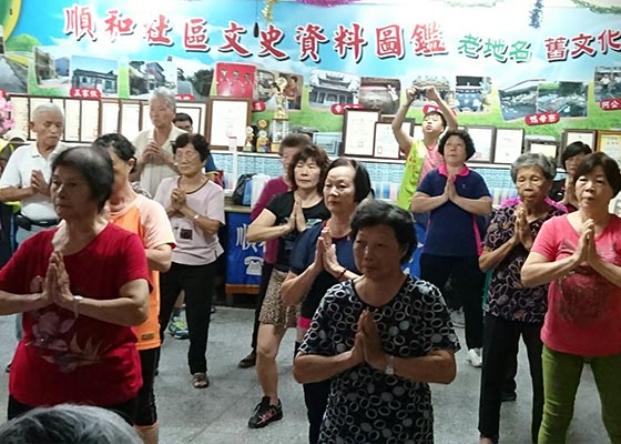 法轮功学员应台湾宜兰县生命线协会“美好人生系列活动”邀请,在壮围乡为该社区老人与“生命线”志工示范法轮功功法。