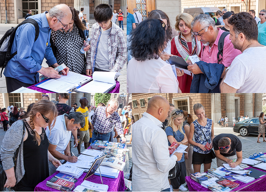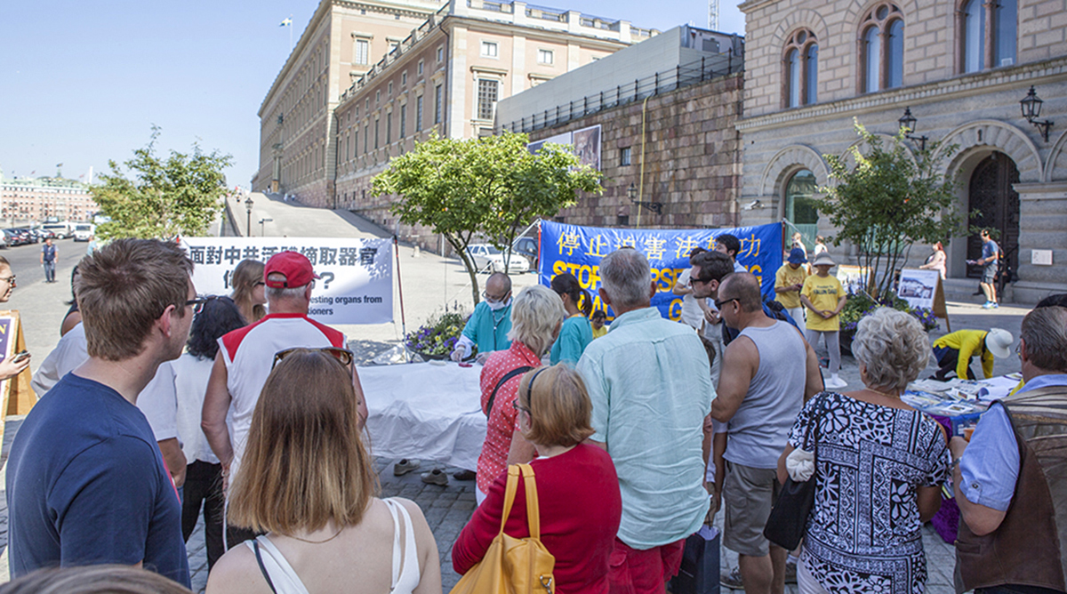 ![]() 在斯德哥尔摩最热闹的皇宫旁的钱币广场,法轮功学员向民众讲真相,揭露中共迫害。 |