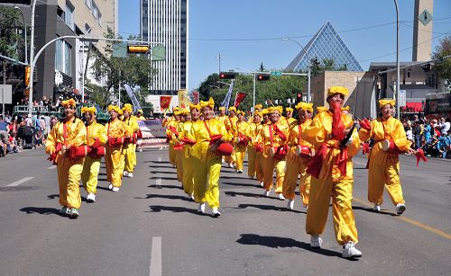 淘金节是有着“阳光之都”美称的埃德蒙顿市最大的夏日狂欢节目,每年都吸引了七十至八十万来自世界各地的游客及当地民众。今年的游行于当天上午十点,在明媚的阳光下开始,全程持续约二小时。今年的淘金节游行有约一百一十个团体参加,而法轮功团体由天国乐团、花车、仙女队和腰鼓队组成,以其强大的整容、鲜艳的色彩、和振奋人心的精神面貌而特别令人瞩目。