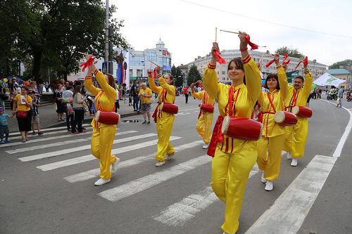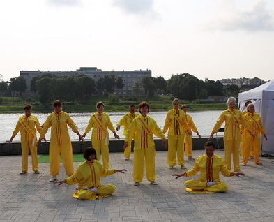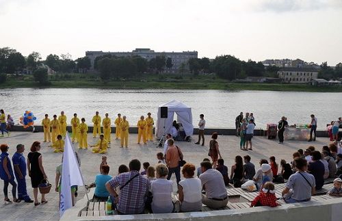 游行结束后,在热闹非凡的韦利卡亚河畔(Velikaya)岸边,法轮功学员向更多的人们展示缓慢优美的五套功法,并进行了腰鼓和“法轮大法好”等舞蹈表演。