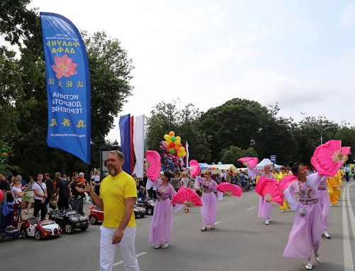 游行有当地企业,各类商业和社会的四十多个团体参与,法轮功队伍也在其中。法轮功队伍包括三个方阵,分别为仙女队、功法展示方阵和腰鼓队。法轮功的游行队伍伴着“法轮大法好”的乐曲徐徐前进,让人眼前为之一亮,沿途观看的人纷纷拿出手机、相机拍照合影,想记录下这美好的画面。身穿仙女服的法轮功学员手持花篮沿途赠送给观众精美的纸莲花和介绍法轮功的资料。