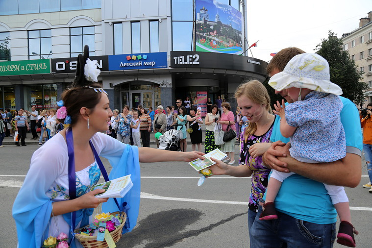 二十三日当天,在城市的各个角落都热闹非凡,在韦利卡亚河畔(Velikaya)岸边,全天,法轮功学员都在教小孩子们叠纸莲花,向他们讲述活动的意义是支持那些在中国遭受不公对待的他们的同龄人。同样的年龄,只因为学炼法轮功按照“真善忍”做一个好孩子,却遭到中共无辜的伤害,饱尝这个年龄不应有的痛苦。“真善忍”是普世的价值,法轮功学员告诉学折莲花的孩子们,希望他们可以按照这个原则成长为对社会有益的人和令父母放心的好孩子。