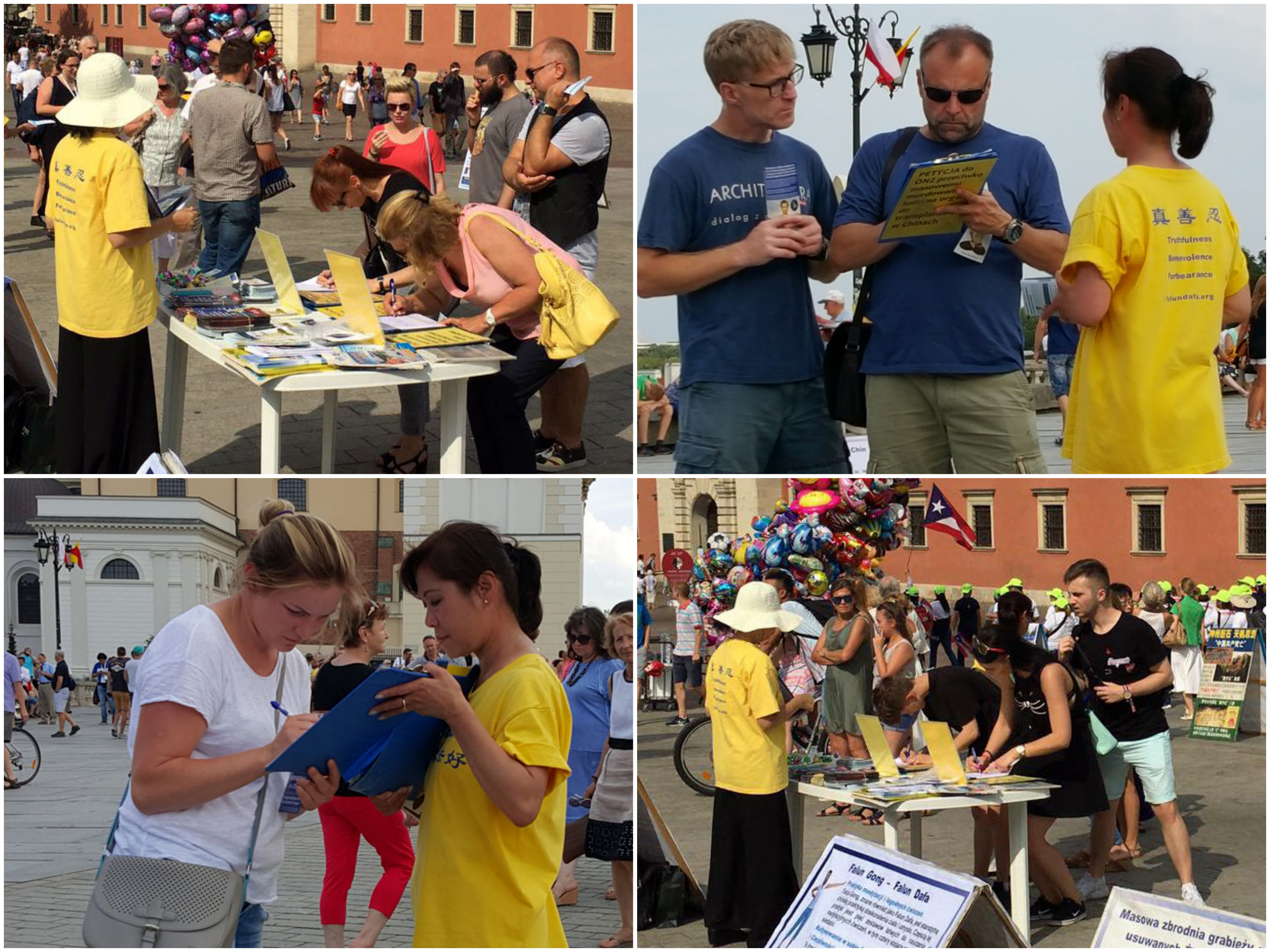 七月二十四日,波兰法轮功学员在华沙中使馆前集体静坐抗议中共迫害法轮功十七周年并在华沙古城举办全天讲真相活动,受到各国游客的极大关注,了解真相的民众排队参加证签,七月二十四日共收到六千多人的签名,特别是路过的中国人认真听取法轮功真相,接受法轮功资料,有一位中国导游坐下来长时间听真相,直到活动结束都不愿离开。