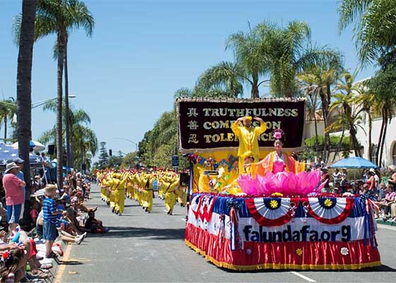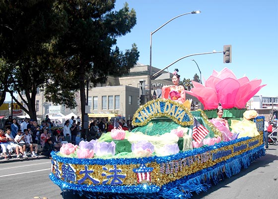 七月四日,旧金山湾区的法轮功学员应邀参加红木城独立日游行,受到主办方和中西民众的赞誉。展现“法轮大法 真善忍”的花车获得一等奖。