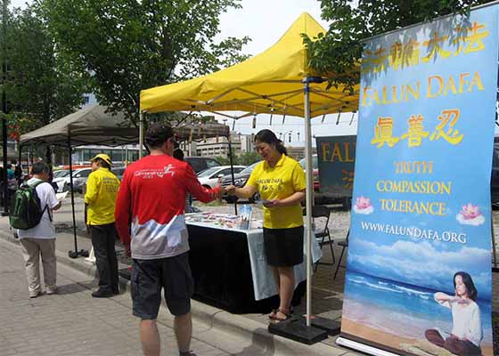 七月一日是加拿大国庆日,在卡尔加里市中心多处的庆祝活动中,该市法轮功学员进行功法演示,向民众传递真善忍的美好,获得好评。
