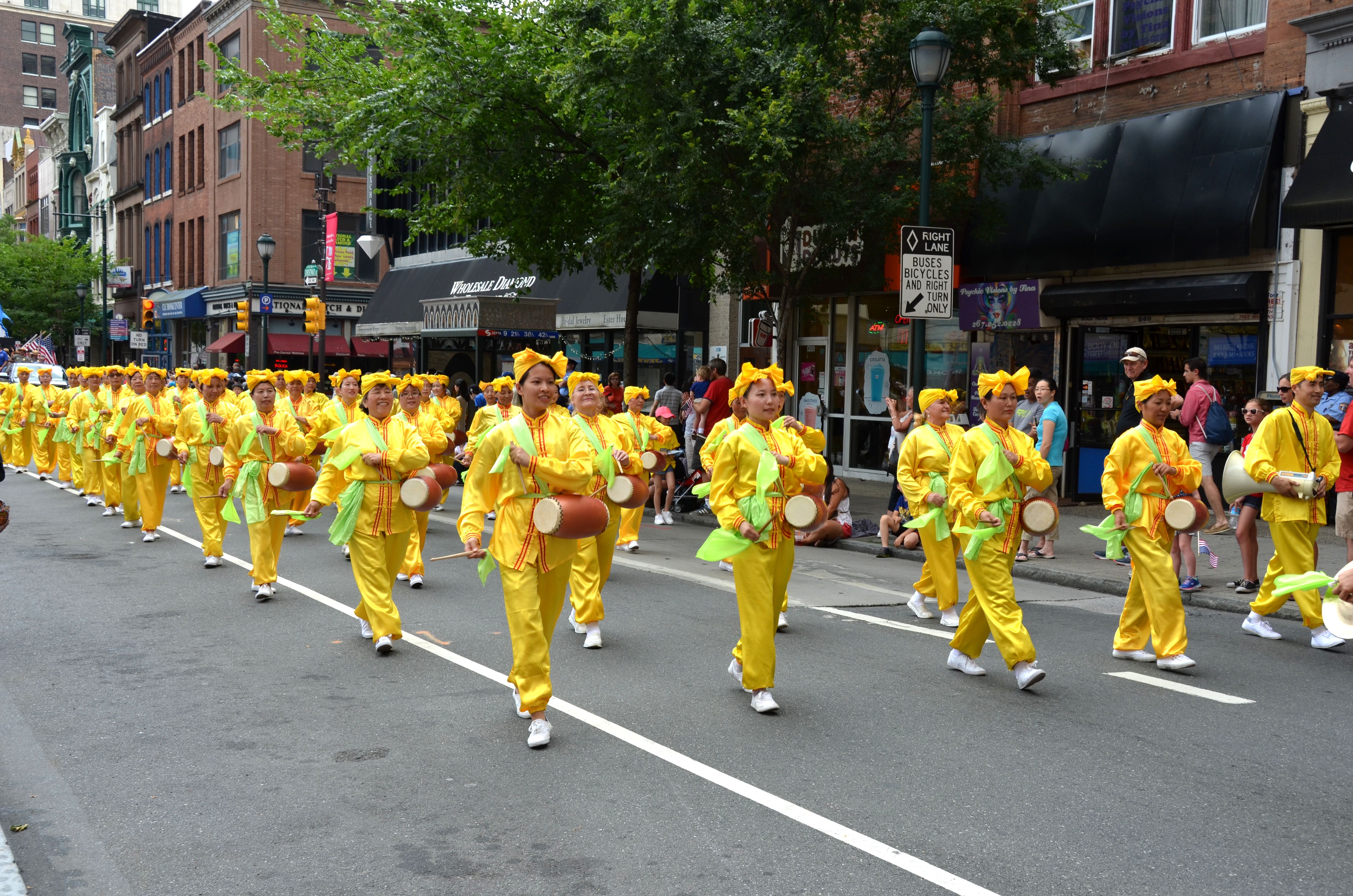 七月四日星期一,热情的民众早早就在游行路线的两侧等待游行队伍的到来。上午十一点,游行队伍从费城独立宫前出发。六十多名法轮功学员组成的腰鼓队,随着《法轮大法好》的优美音乐,腰鼓声雄壮而整齐,他们身着亮黄色,踏着整齐轻快的步伐,在游行队伍中特别引人注目。欢快的鼓声和他们发自内心的真诚笑容,带来一派祥和慈悲的气息,所到之处赢得了路旁观众的热烈掌声,许多人挤出人群拍照,高声欢呼。