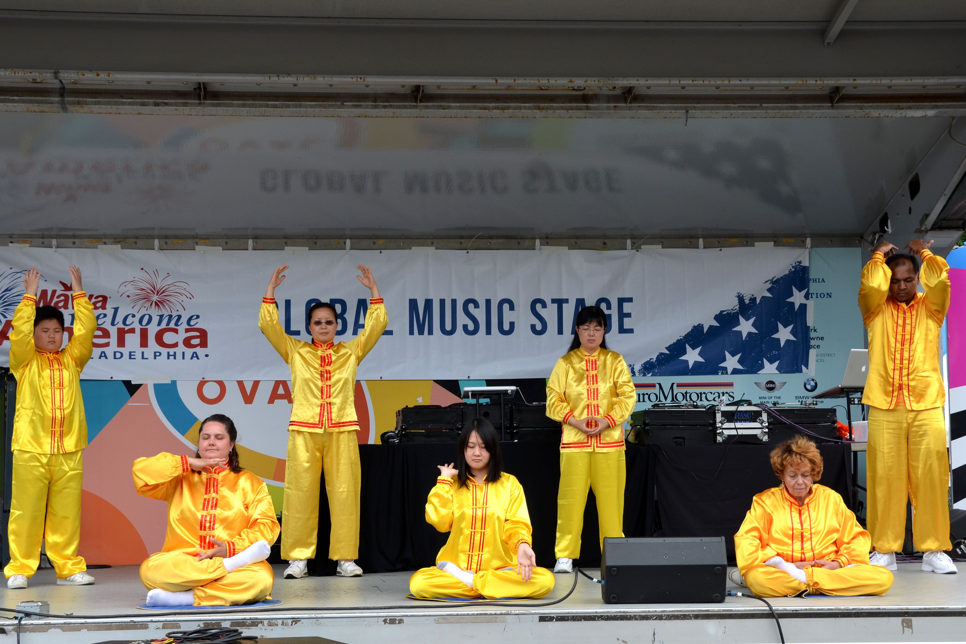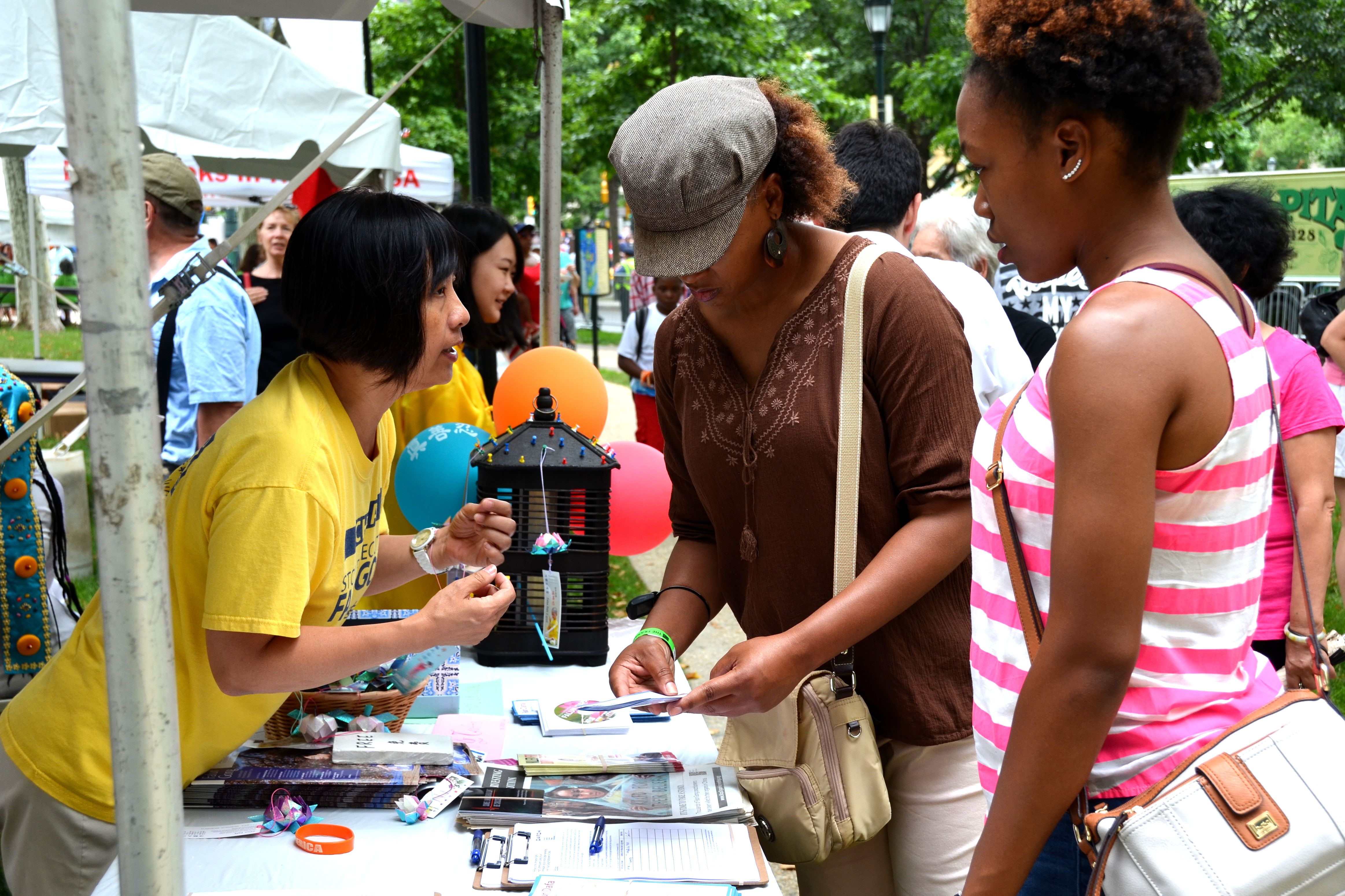 游行结束后,在本杰明•富兰克林大道上,美国独立日最大的免费精彩音乐会和各种娱乐活动又开始了。法轮功学员在大舞台上演示法轮功功法,并有学员在旁讲解。随后法轮功学员还表演了舞蹈和唱歌等文艺节目。此外,法轮功学员还在庆祝活动中设立了展位,向人们介绍法轮功,众多游人驻足并了解真相。