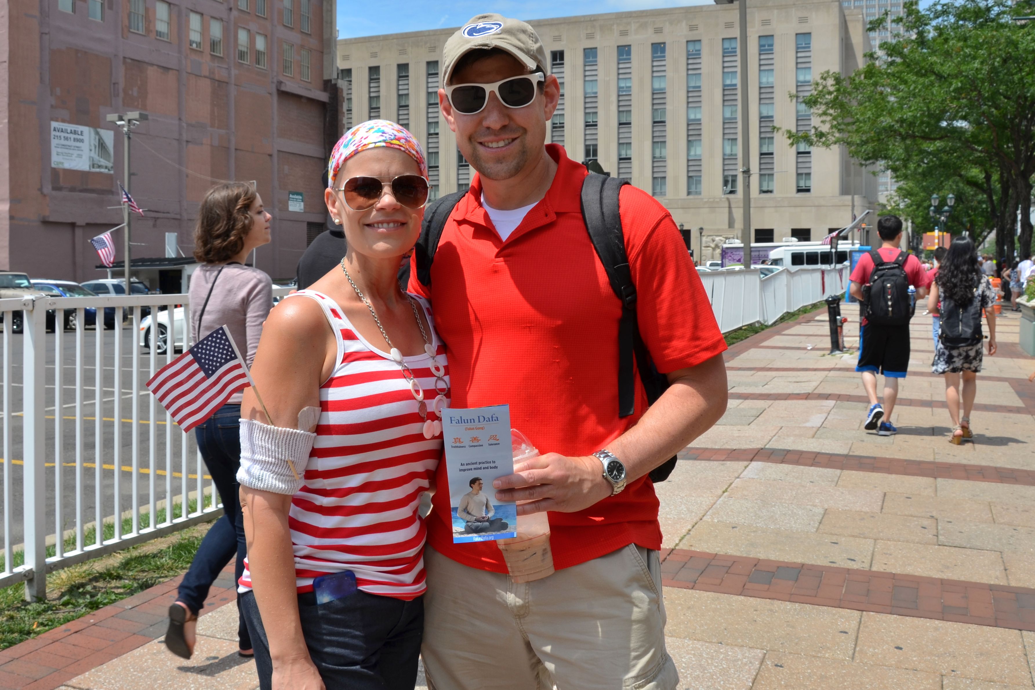 家住费城的Rob和太太Jane在路旁为法轮功腰鼓队喝彩。Rob先生知道中共对法轮功的迫害,但不知道为什么。在得知中共活摘法轮功学员器官的暴行后,他惊讶不已,说:法轮功学员们看起来非常祥和真诚,因信仰被迫害实在难以置信。他在接受了法轮功真相资料后表示,回去一定要认真了解这个古老的修炼法门。