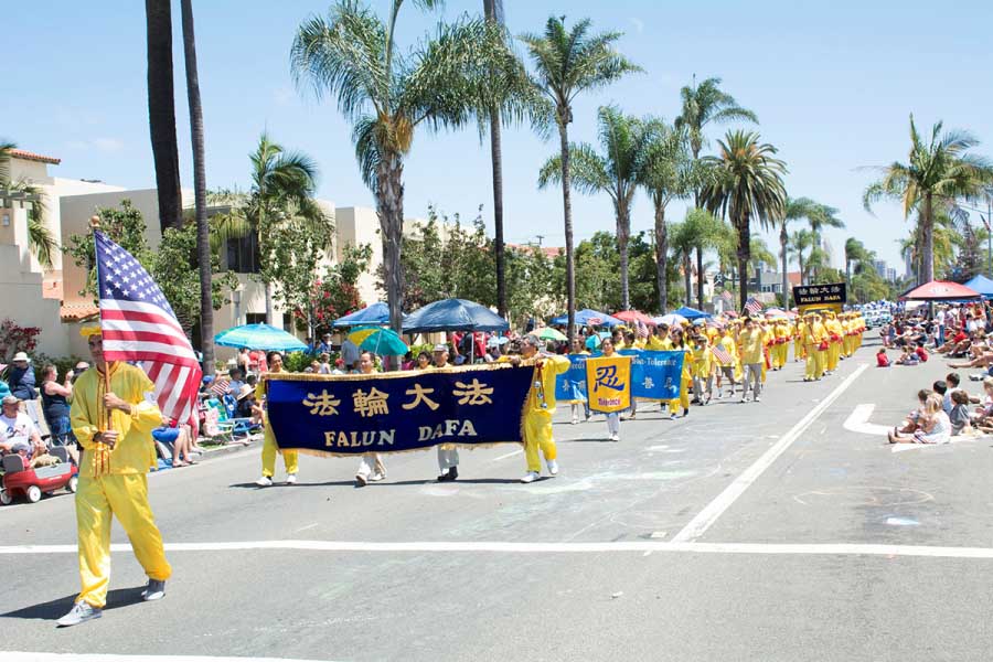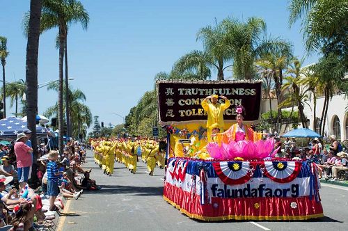 科罗纳多岛上的独立日游行每年有一百多个队伍参加,法轮功学员的花车几乎每年都获奖。今年的花车以一朵粉色的大莲花为主,搭配亮丽的独立日装饰,并附以中英文“法轮大法”的横幅。