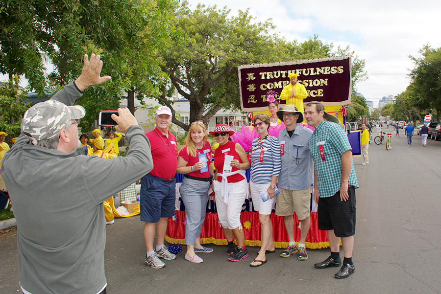 【明慧网二零一六年七月六日】(明慧记者贾维、李若云北加州旧金山湾区报道)二零一六年七月四日,美国北加州旧金山湾区红木城独立日游行结束后,一对年轻的西人夫妇来到法轮功学员跟前,兴奋问道:“你们赢了吗?”学员惊讶地回答:“赢了什么?”他们说:“游行的第一名啊。你们是如此令人惊叹,太棒了!是所有队伍中最耀眼的!尤其是你们的花车,太美了!”