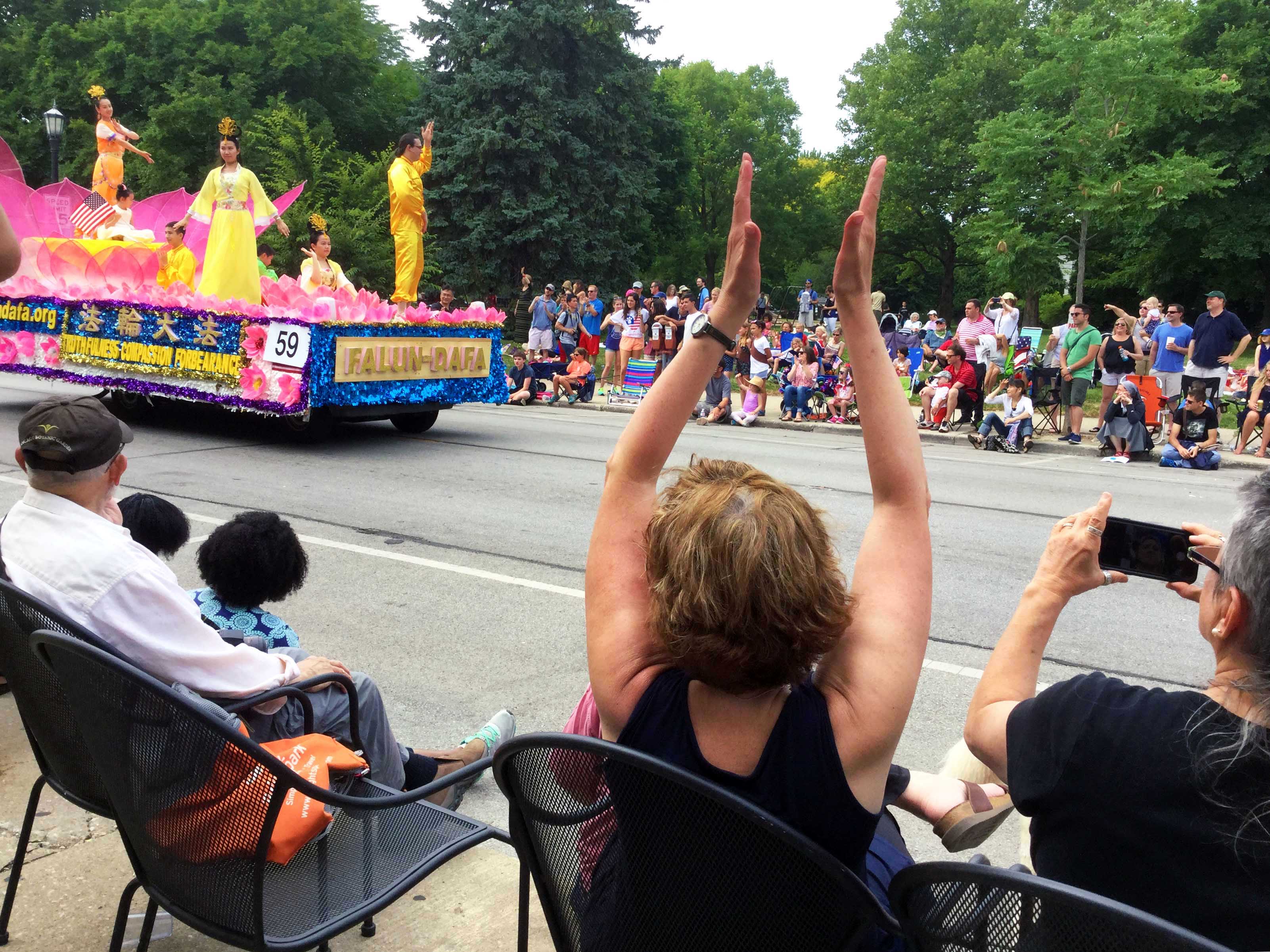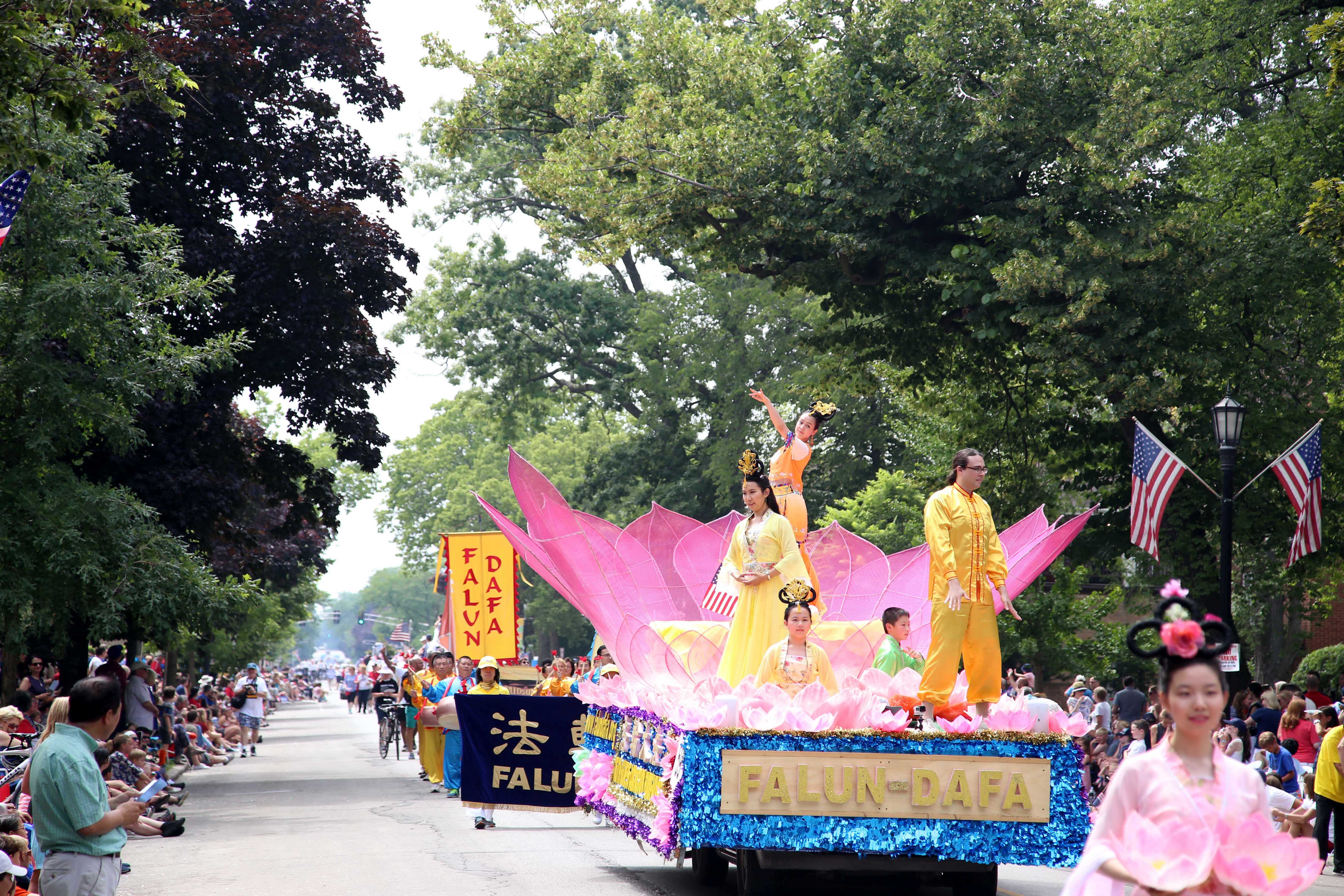 ![]() 图1:芝加哥法轮功学员参加埃文斯顿市美国独立日游行,主办方与观众赞花车亮眼。 |