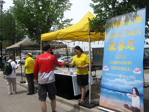 退休前就职于人权机构的乔瑟夫,是英文大纪元的长期读者,他读过很多中国近一百年历史的书,对中共历次运动迫害人权的历史非常了解。和法轮功学员交谈中,他认为法轮功学员长期坚持和平理性的反迫害,这非常了不起。