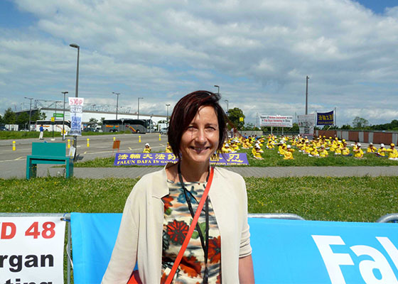 欧洲议会议员雷纳塔•布里阿诺(Renata Briano)来到法轮功学员炼功的地方,拿出手机自拍,并表示会把照片放到脸书上,让更多的人看到法轮功。