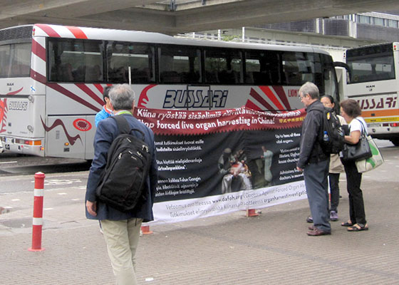 为了让这些专业人士了解中共活摘法轮功学员器官的罪行,部分芬兰法轮功学员在此期间来到会场外举办征签活动。