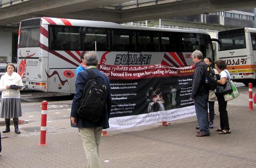 为了让这些专业人士了解中共活摘法轮功学员器官的罪行,部分芬兰法轮功学员在此期间来到会场外举办征签活动。