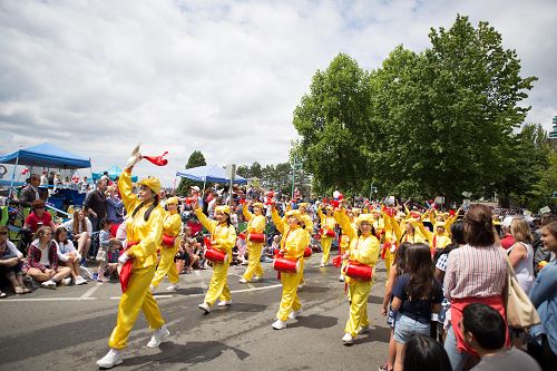 经过主席台时,主持人介绍:“法轮大法是以真善忍特性为指导的佛家上乘修炼功法,在当今世界各地弘传。”她念了两遍“真善忍”后接着说:“还有比这更好的吗?谢谢你们来参加这次的游行!”