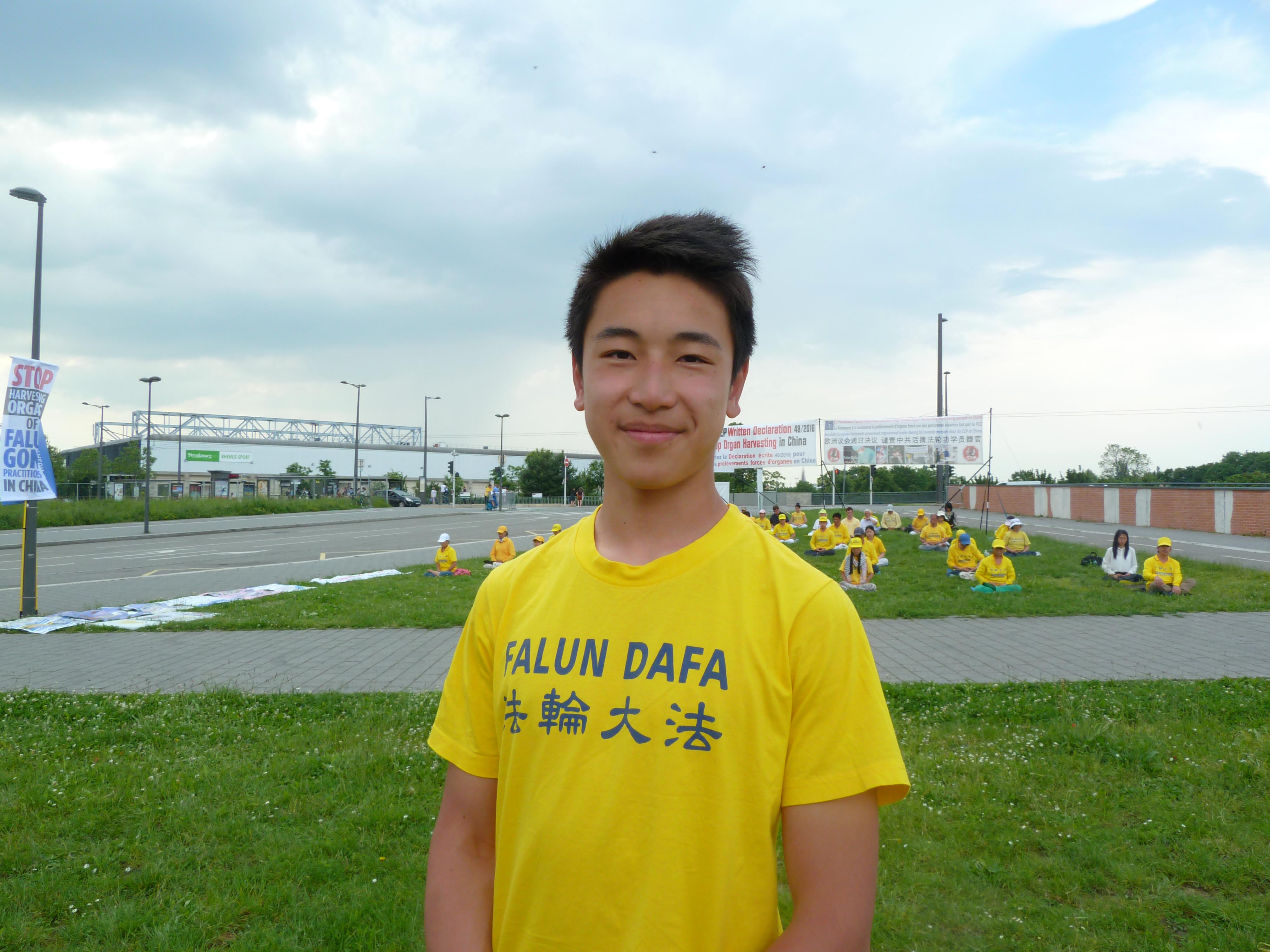 黎焱在斯特拉斯堡呆了三天半,这是他放暑假后的第一周。他的母亲也炼法轮功,但因为工作忙,不能来,他是由不炼功的爸爸一大早四点钟送到爱尔兰都柏林的飞机场的,他和其他法轮功学员一同辗转飞机和汽车八小时到这里来向政治家请愿。