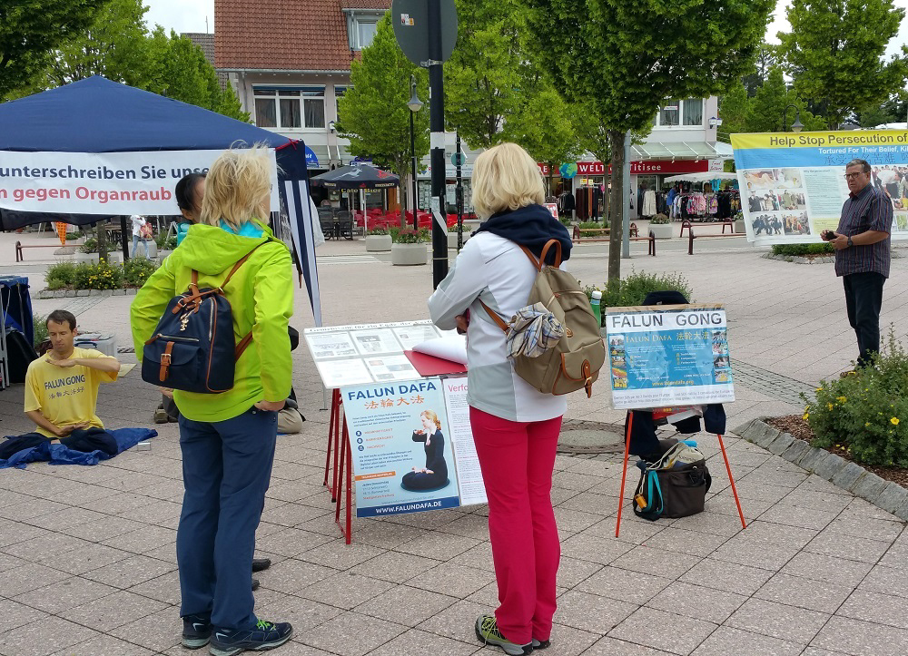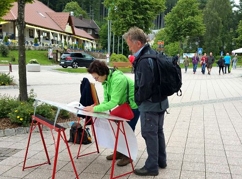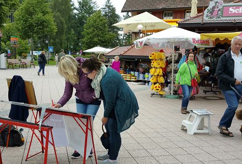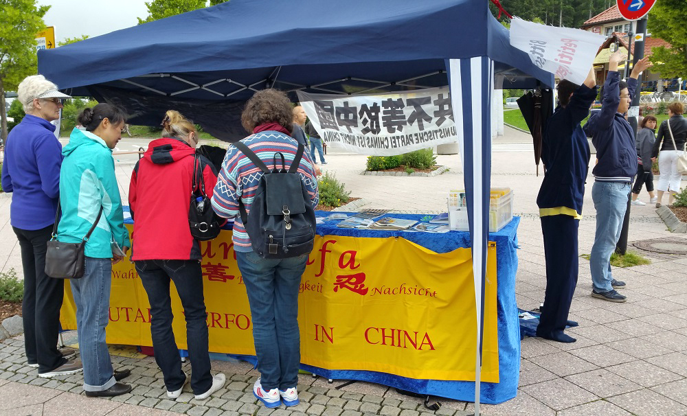 【明慧网二零一六年七月九日】二零一六年七月二日周六,德国法轮功学员在德国黑森林缇缇湖风景区举办法轮大法信息日,继续向中西方民众传播法轮功的真相,揭露中共大规模活摘法轮功学员器官的罪恶,并征集签名制止迫害。明真相后,西方民众签名支持制止迫害,中国游客三退(退出中共党、团、队)。