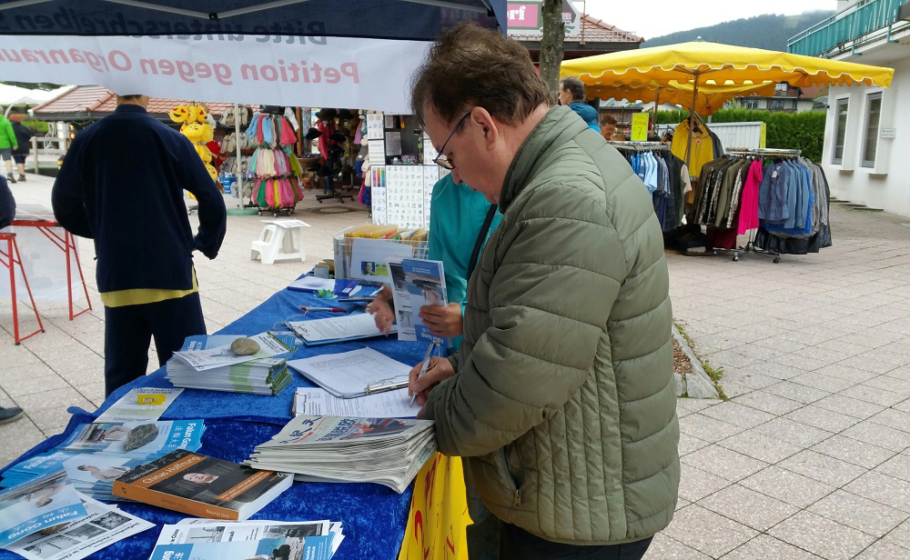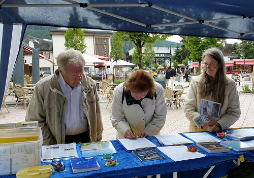 德国Arthur先生在征签簿上签完名后说:现在这个世界上很多人,只知道赚钱,不关心他人,不分真假善恶,这是很危险的。我希望,我的支持能对你们反迫害有所帮助。