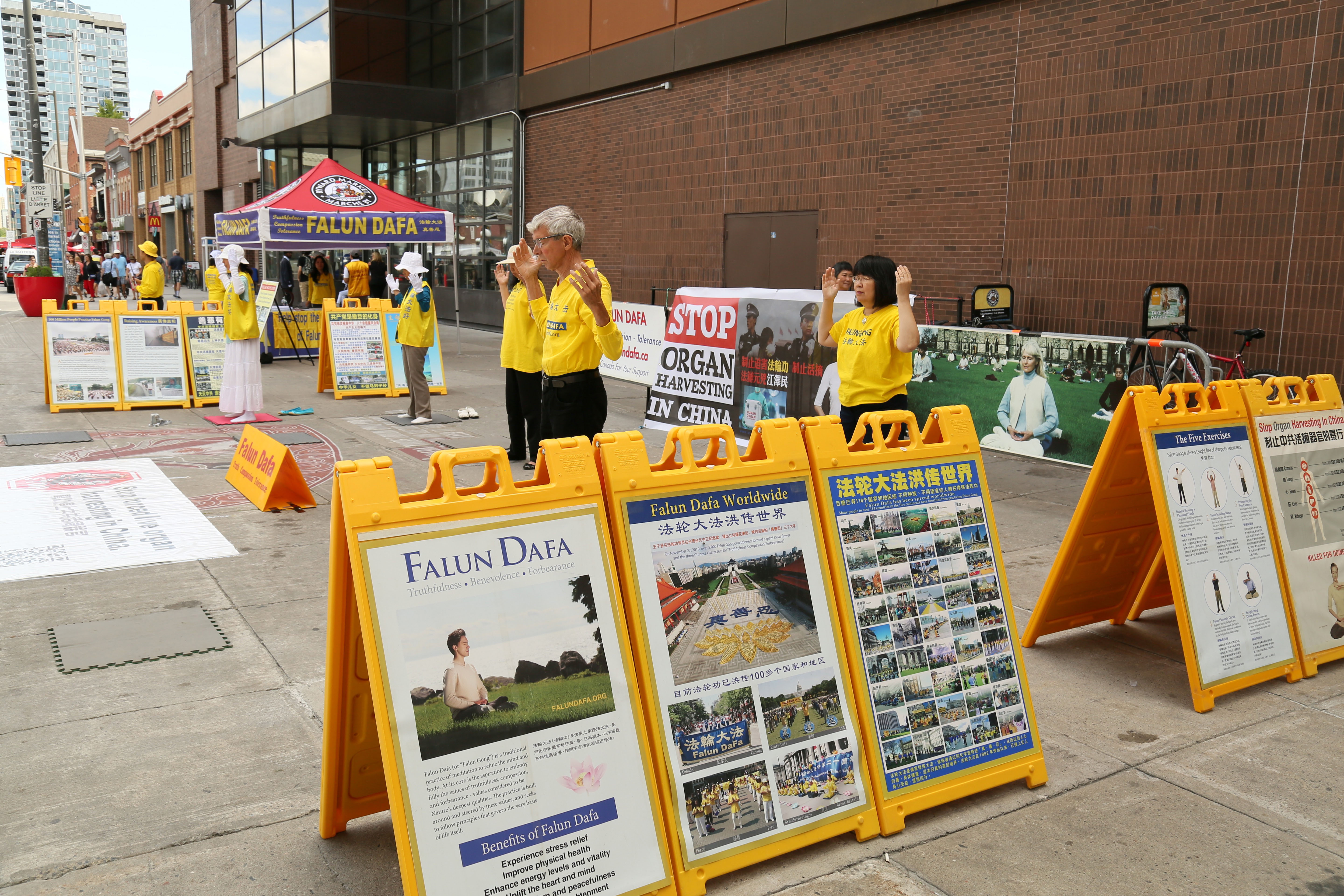 ![]() 图1-3:七月三十日,法轮功学员在渥太华市中心最繁华的拜沃德市场(ByWard Market)前,通过展板、横幅以及向主流社会曝光发生在中国的活摘法轮功学员器官的罪恶,许多民众驻足了解真相。 |