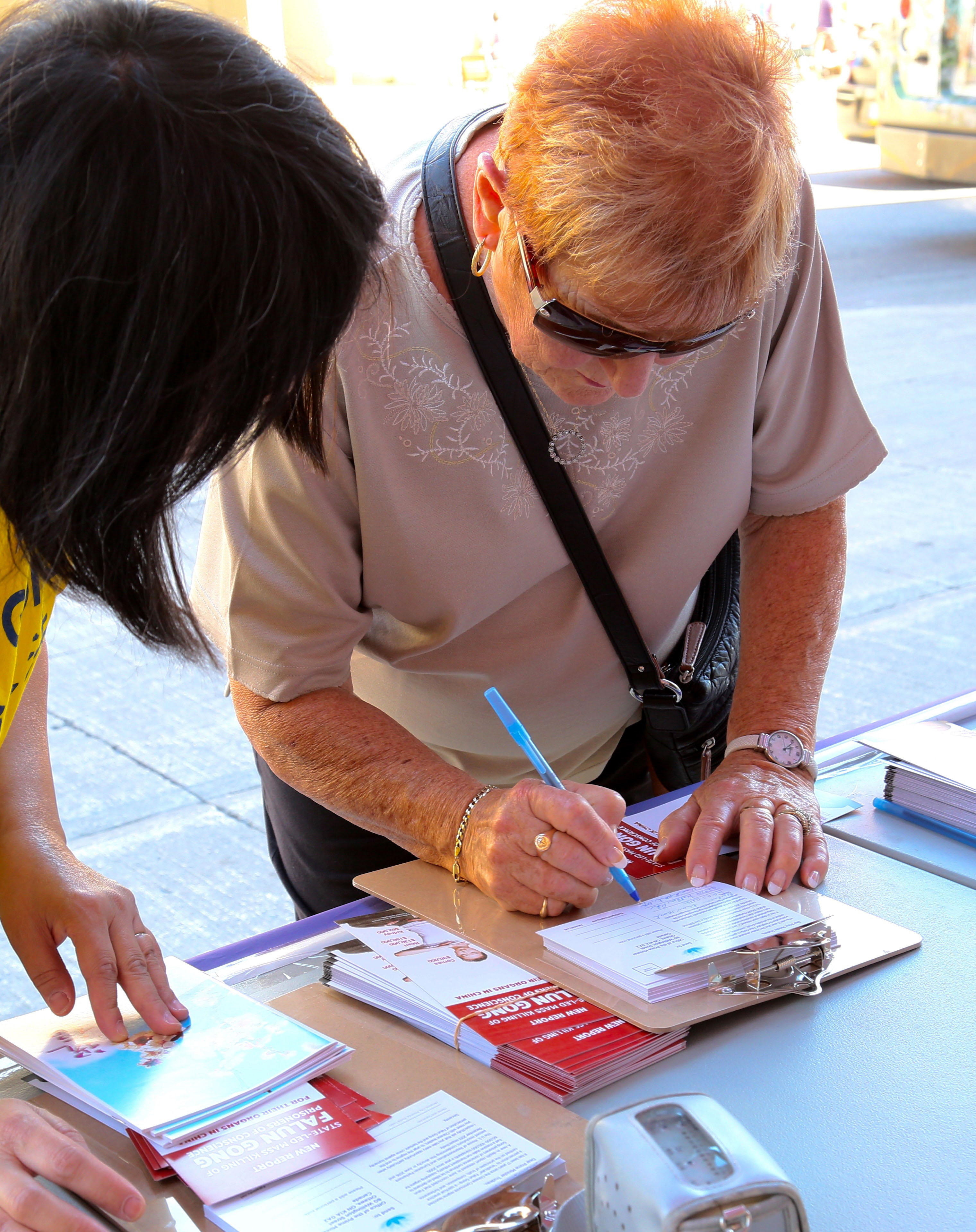 在拜沃德市场西南角的George街上,法轮功学员平和的功法演示和内容丰富的真相展板让许多人停下脚步,深入了解法轮功真相。得知中国发生的针对无辜民众如此残酷迫害,许多善良人非常震惊——在二十一世纪还发生如此惨烈的针对无辜信仰真善忍民众的暴行。许多人立刻决定在制止活摘的请愿书上签名,希望制止这场对法轮功学员的群体灭绝犯罪。