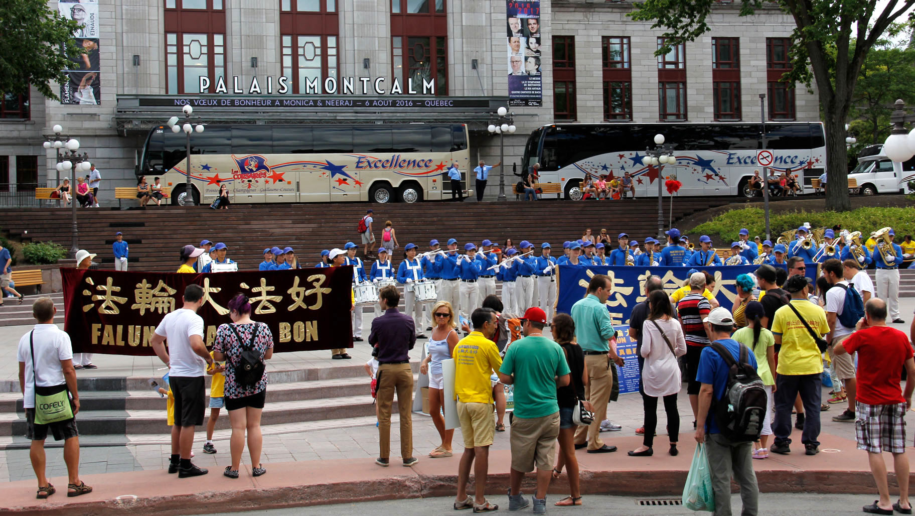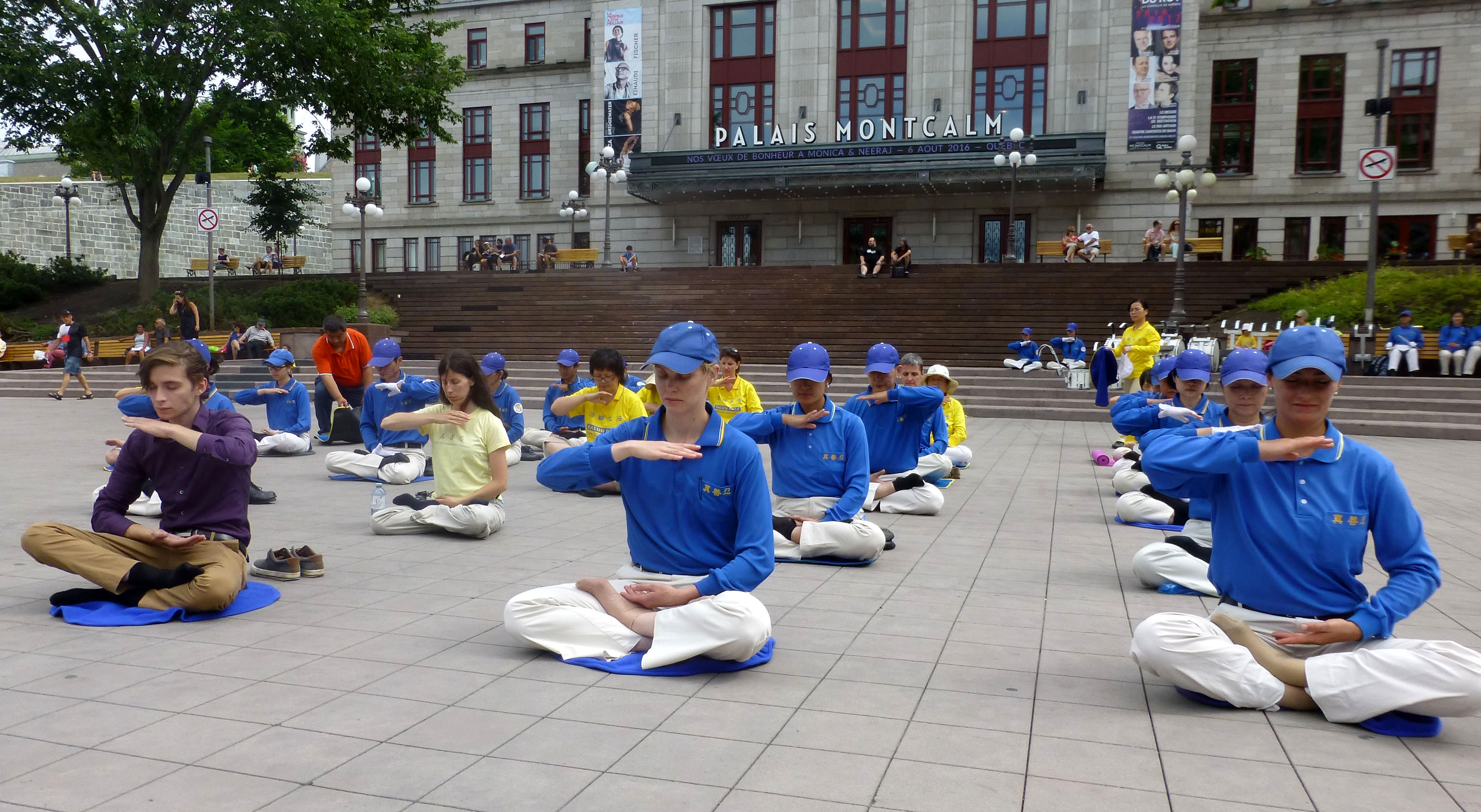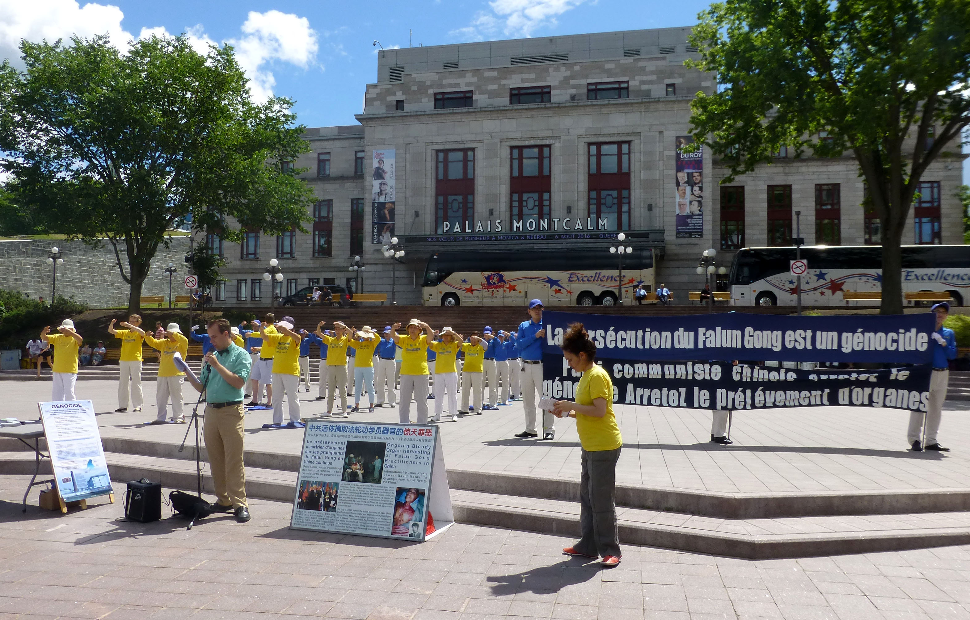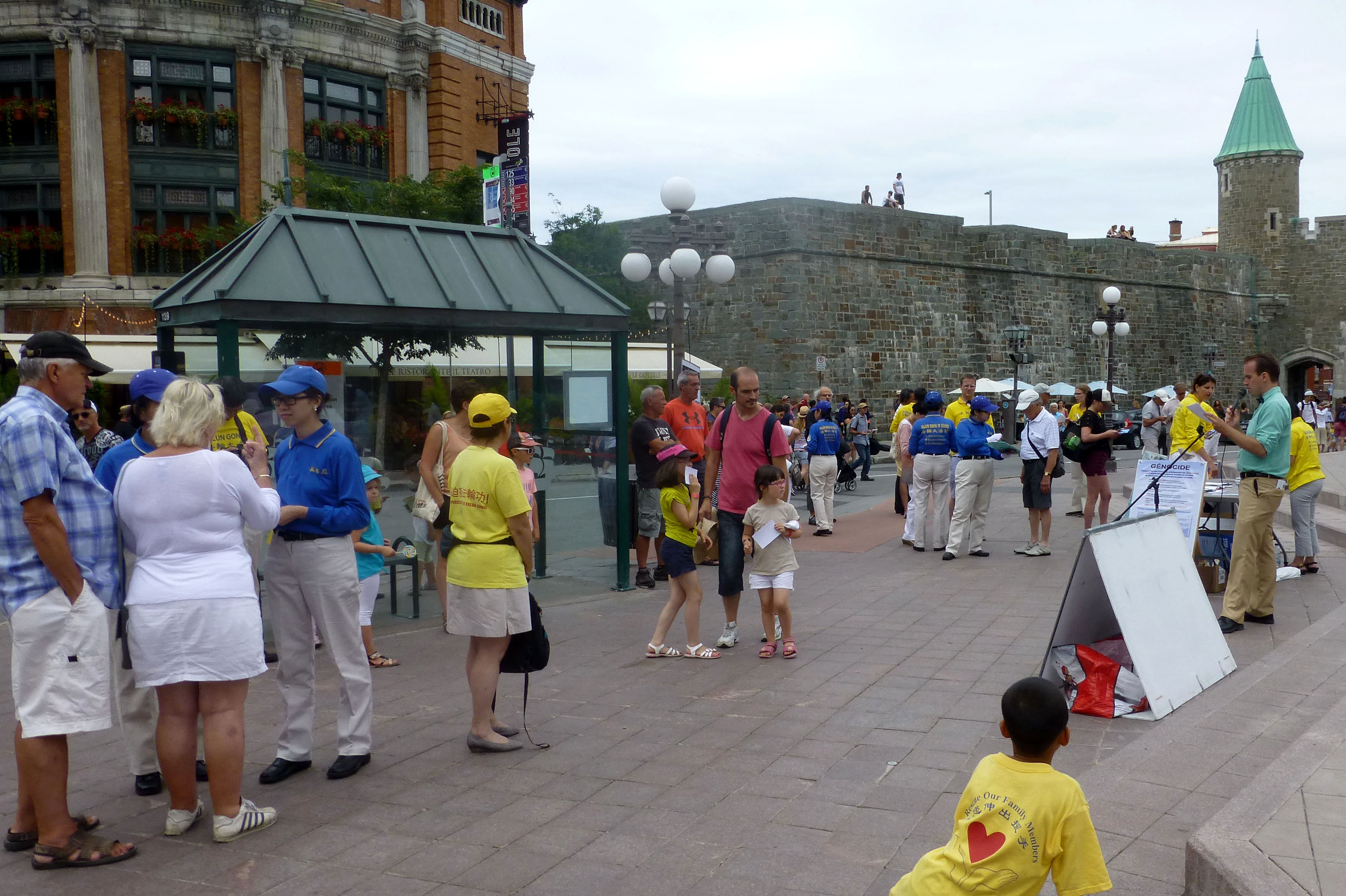 魁北克城不仅是加拿大魁北克省的首府,而且还是一个具有浓郁法裔风情的城市。而Place Dyouville 广场又是一个很特别的地方,城堡一样的环绕城墙吸引着世界各地的游客来此游览。身着黄色T恤的法轮功学员在广场上,有的伴随着优美的音乐演示法轮功的五套功法,有的向当地民众和游客介绍法轮大法,并揭露中共对法轮功长达十七年的迫害。