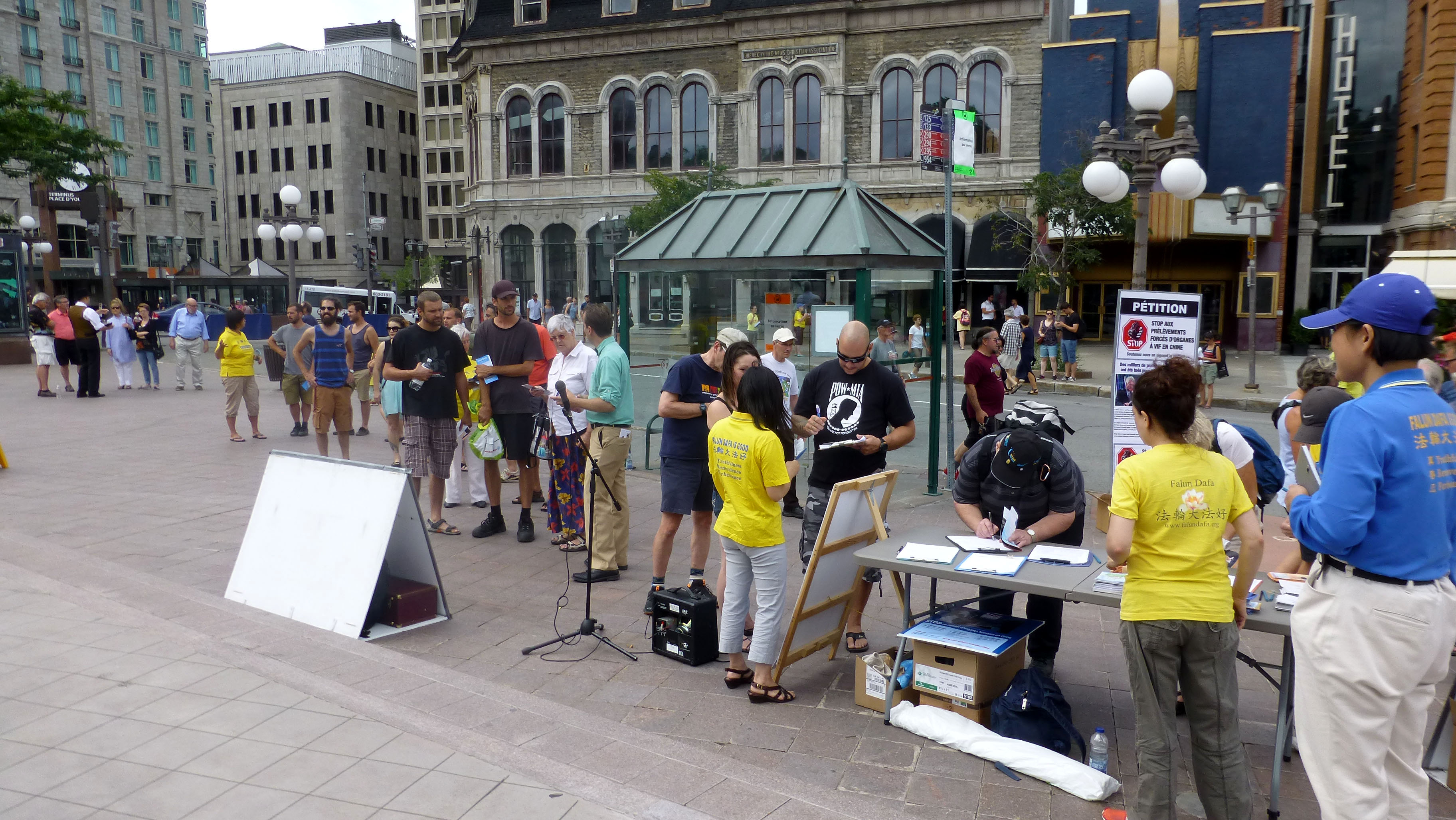 ![]() 图1-2:二零一六年八月六日,加拿大学员在在魁北克省首府魁北克城的Place Dyouville广场举办征签反迫害集会,告诉民众法轮功的美好,揭露中共对法轮功学员的残酷迫害,并呼吁帮助制止迫害。许多民众驻足观看。 |