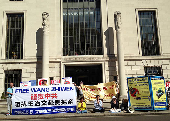 伦敦中使馆前抗议 谴责中共阻挠王治文赴美探亲(图)