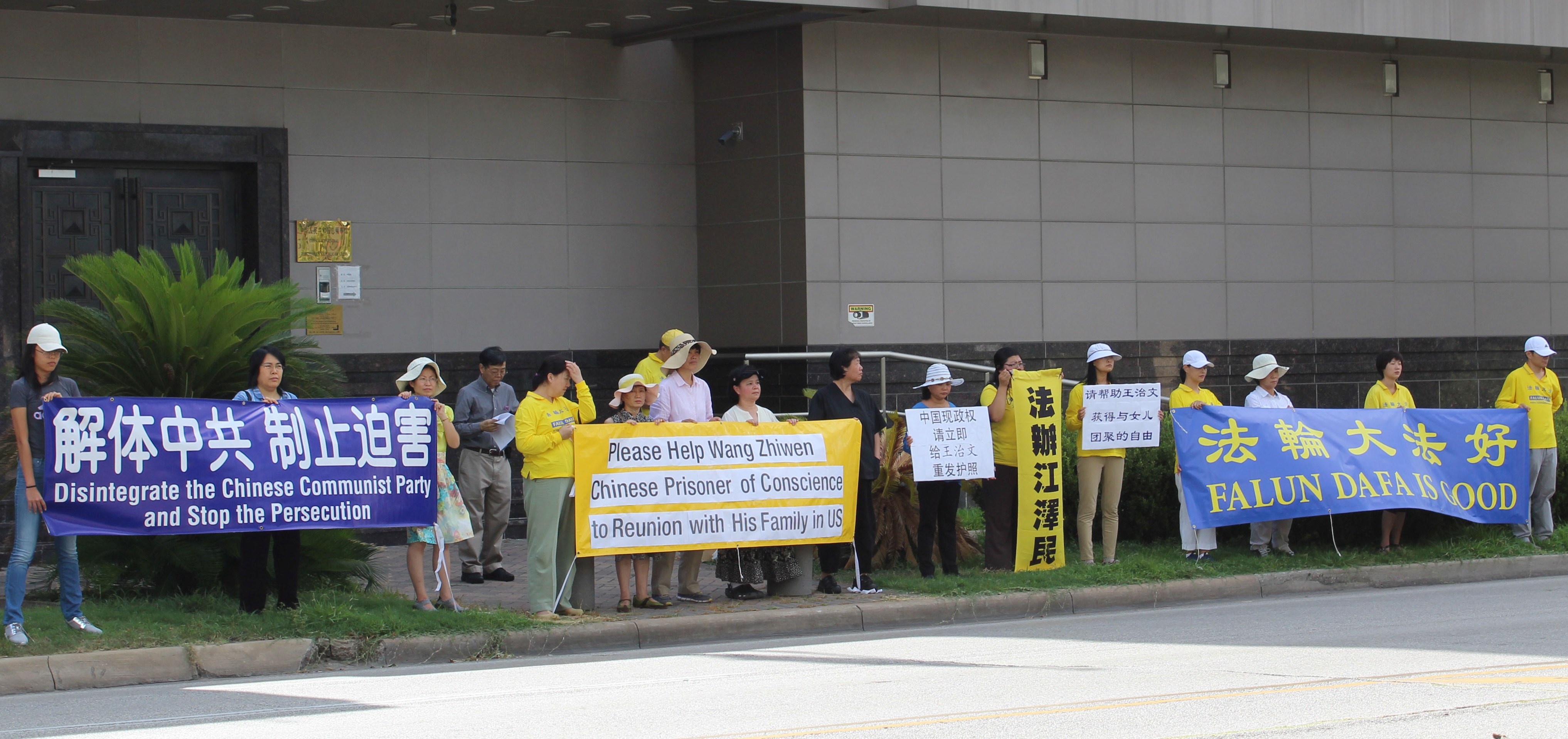 【明慧网二零一六年八月十三日】(明慧记者舒静休斯顿报道)二零一六年八月十一日上午,部份休斯顿法轮功学员在中共驻休斯敦总领馆前举行抗议活动,谴责江泽民、曾庆红等迫害法轮功的元凶阻挠被非法关押了十五年的法轮功学员王治文出境前往美国,要求中共现政权重发护照,让他前往美国与女儿团聚。