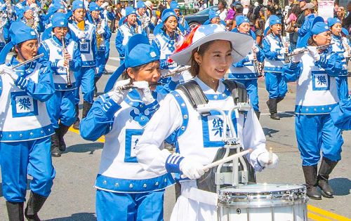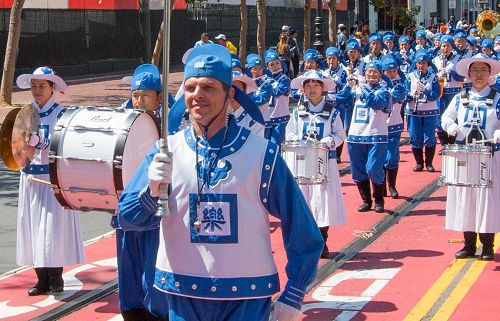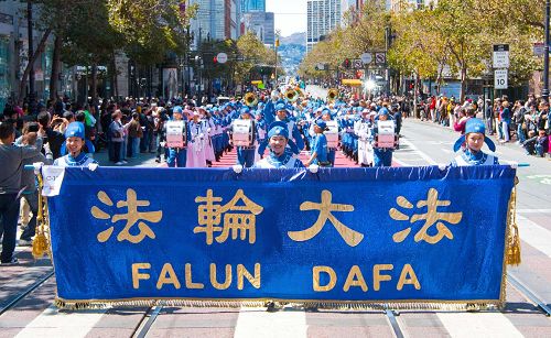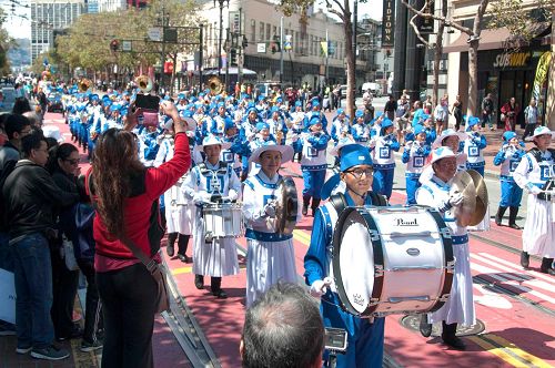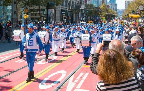 游行从上午十一点开始,从市民中心(Civic Center)沿着市场街一直走到芳草地公园(Yerba Buena Gardens),这是美国最大的菲律宾文化庆典活动。天国乐团为观看游行的民众带来了《法轮大法好》等乐曲,让观众感受到大法的美好。